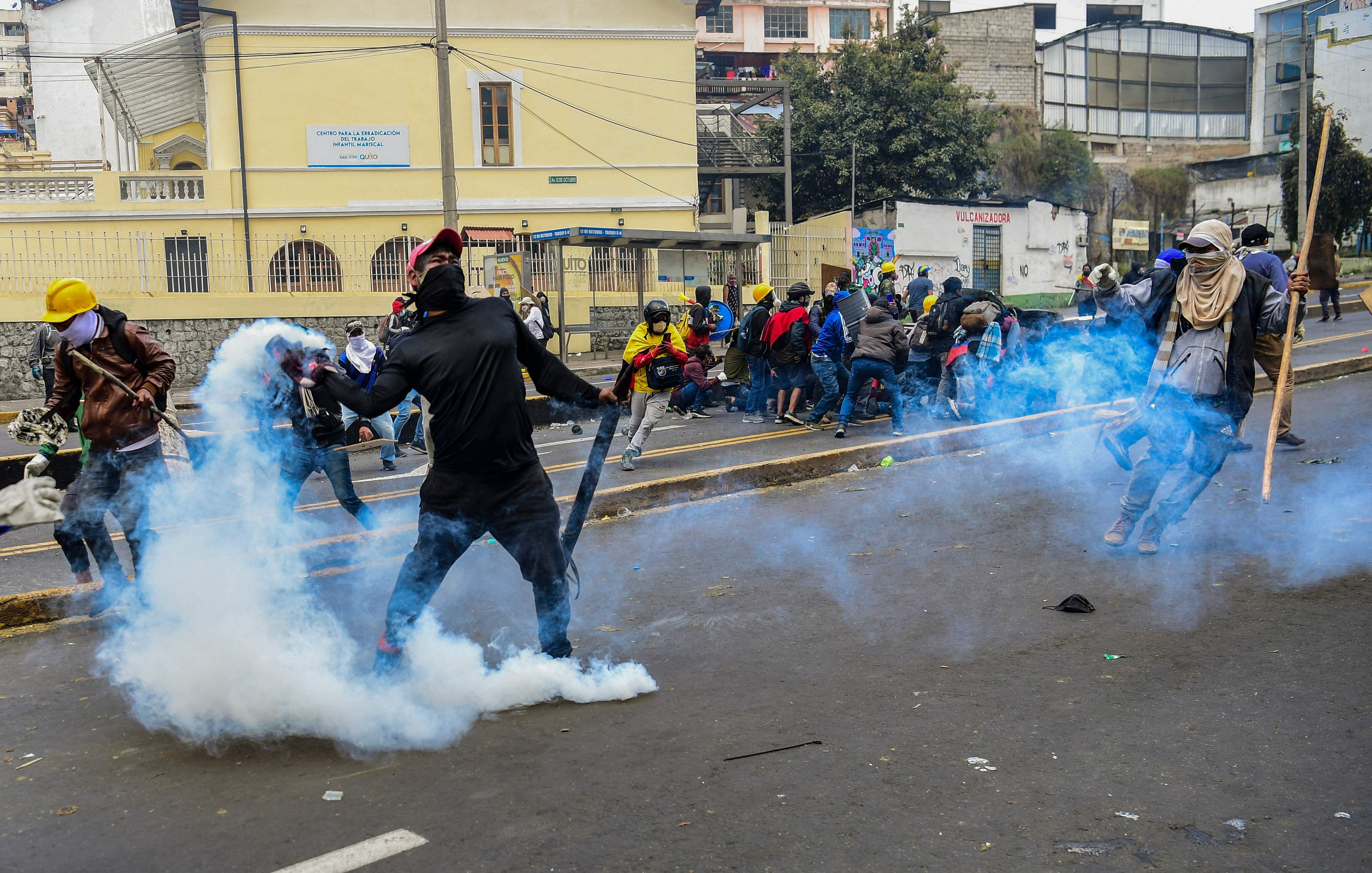 En Quito la mayoría de marchas son pacíficas, pero en las noches estallan los disturbios y los choques con la fuerza pública. Unos 14.000 indígenas se movilizaron en varios puntos del país para exigir una reducción en el costo de los combustibles y una moratoria de los créditos con la banca privada, entre acciones que amortigüen el costo vida.