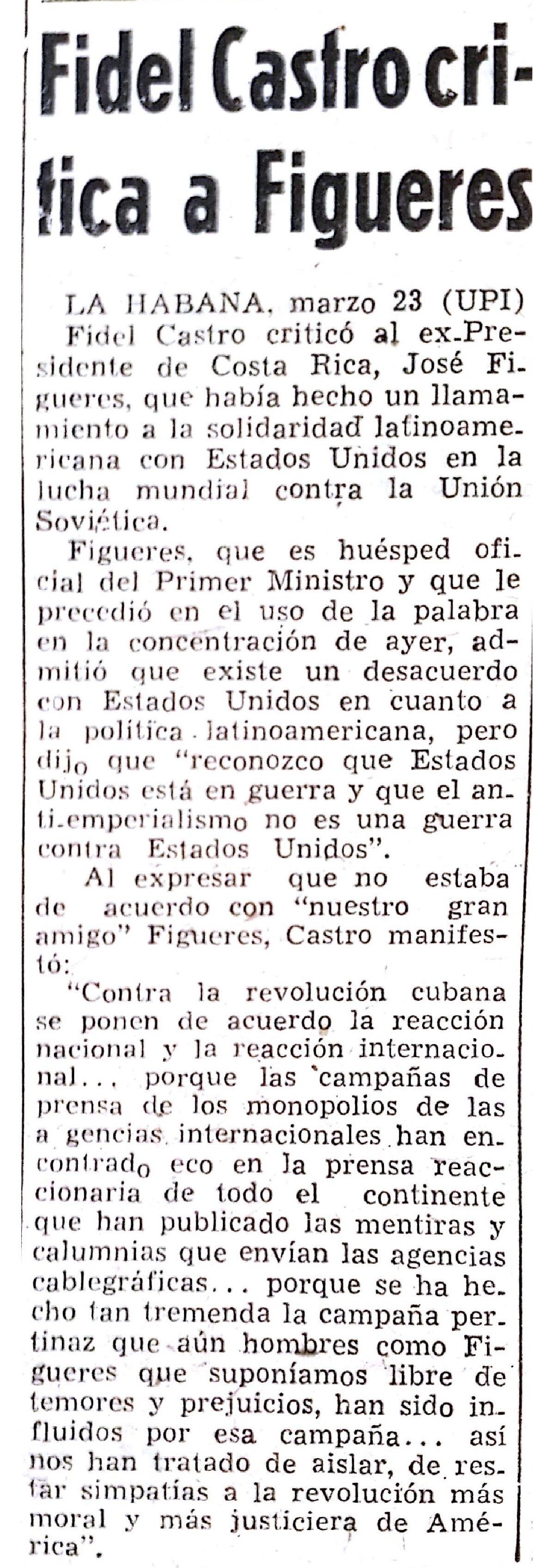 Según reportó La Nación, un día después, el 23 de marzo de 1959, Figueres hizo un llamado a la solidaridad latinoamericana con EE. UU. en la lucha mundial contra la Unión Soviética. "Reconozco que Estados Unidos está en guerra y que el anti-imperialismo no es una guerra contra Estados Unidos", declaró Figueres, de acuerdo con un cable de la agencia de noticias UPI.