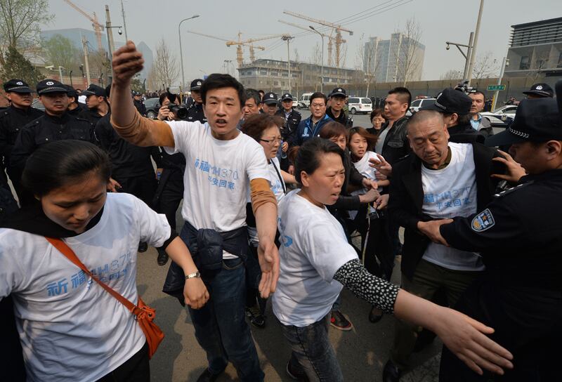 Mientras, en Pekín, un centenar de familiares y allegados marcharon hacia la Embajada de Malasia, arrojaron botellas de plástico y gritaron “¡Mentirosos! ¡Mentirosos!”.