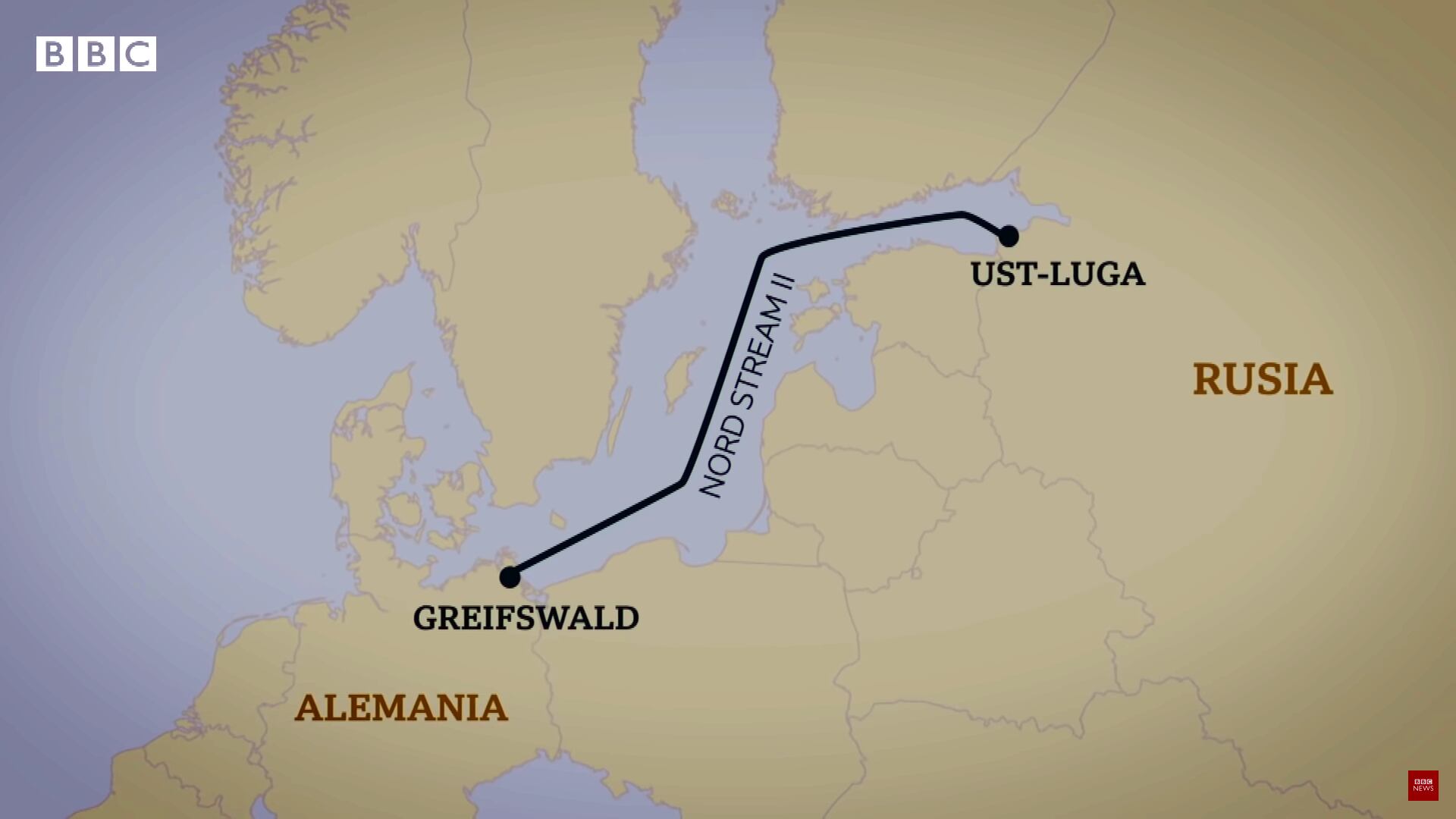 Este 22 de febrero, Alemania detuvo el proyecto que impulsa Moscú para contrarrestar la ventaja que Ucrania tiene con los gasoductos. Rusia lleva años construyendo y completando un faraónico gasoducto por el Mar del Norte, que llevaría el recurso directamente desde Rusia a Alemania (el Nord Stream II). Berlín y la UE no quieren usarlo porque supondría una pérdida de poder para Kiev (capital de Ucrania).