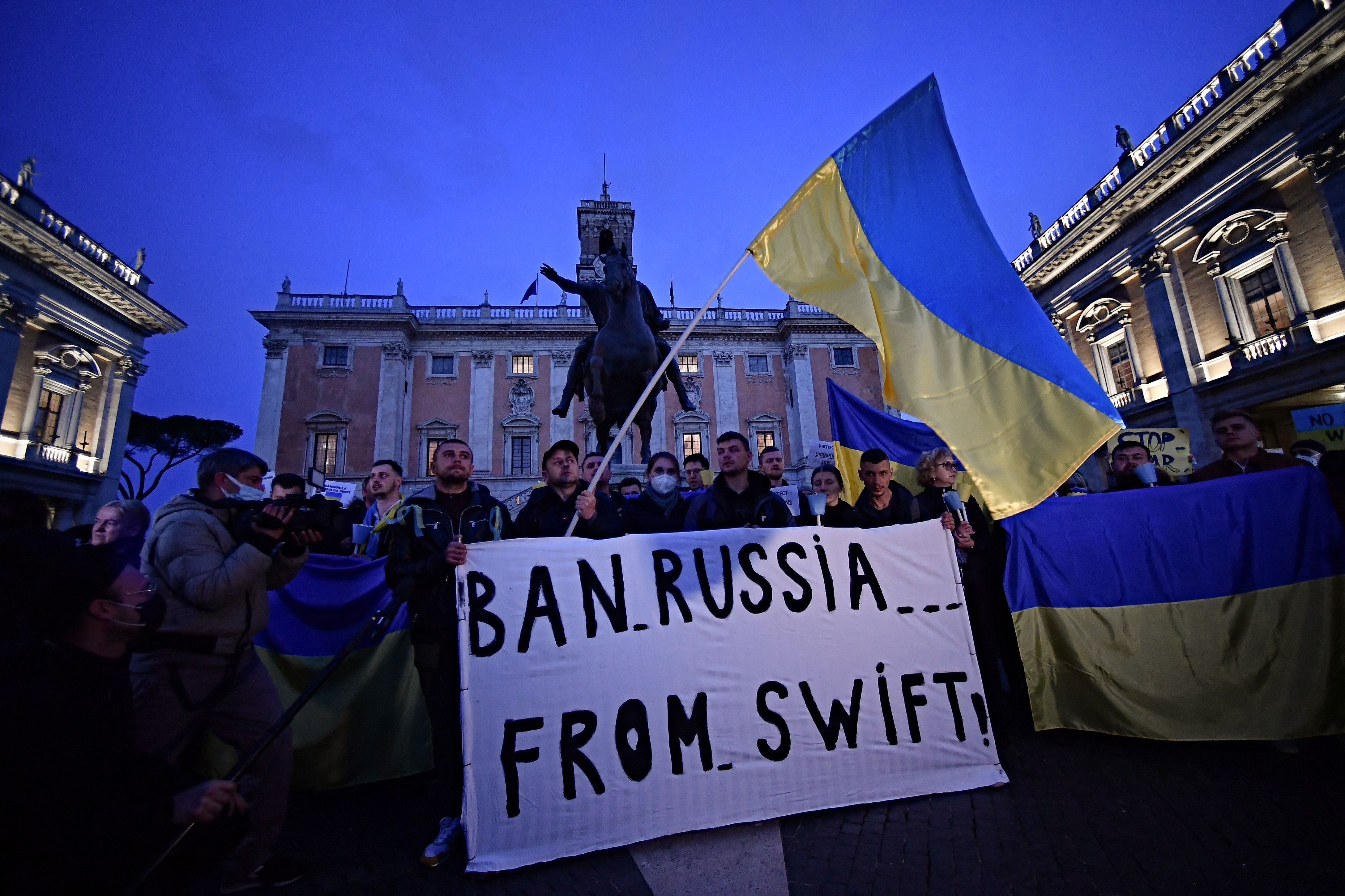 Zelenski pidió a los occidentales que expulsaran a Rusia del sistema de transferencias bancarias SWIFT, pero países de la Unión Europea como Alemania o Hungría han expresado sus dudas por el miedo a que esa medida provoque problemas en la entrega de gas ruso.