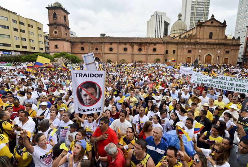Por su parte, Aidee Jiménez, quien explicó que su hijo fue asesinado por las guerrillas, pidió que Colombia “no termine como Venezuela o Cuba” y reclamó “que Santos renuncie” y no “esclavice al pueblo”.