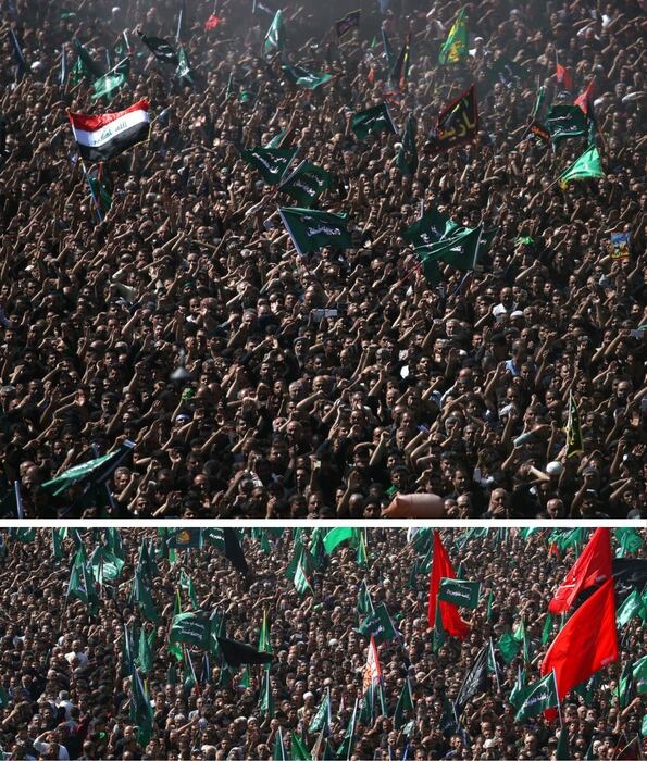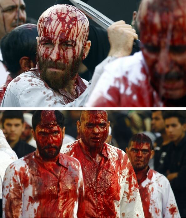 Vestidos de negro, los peregrinos participaron en la procesión de "tatbir", flagelándose la espalda y el torso con cadenas, para conmemorar el martirio del imán Husein, asesinado en el año 680 por las tropas del Califa de los Omeyas Yazid en la batalla de Kerbala.