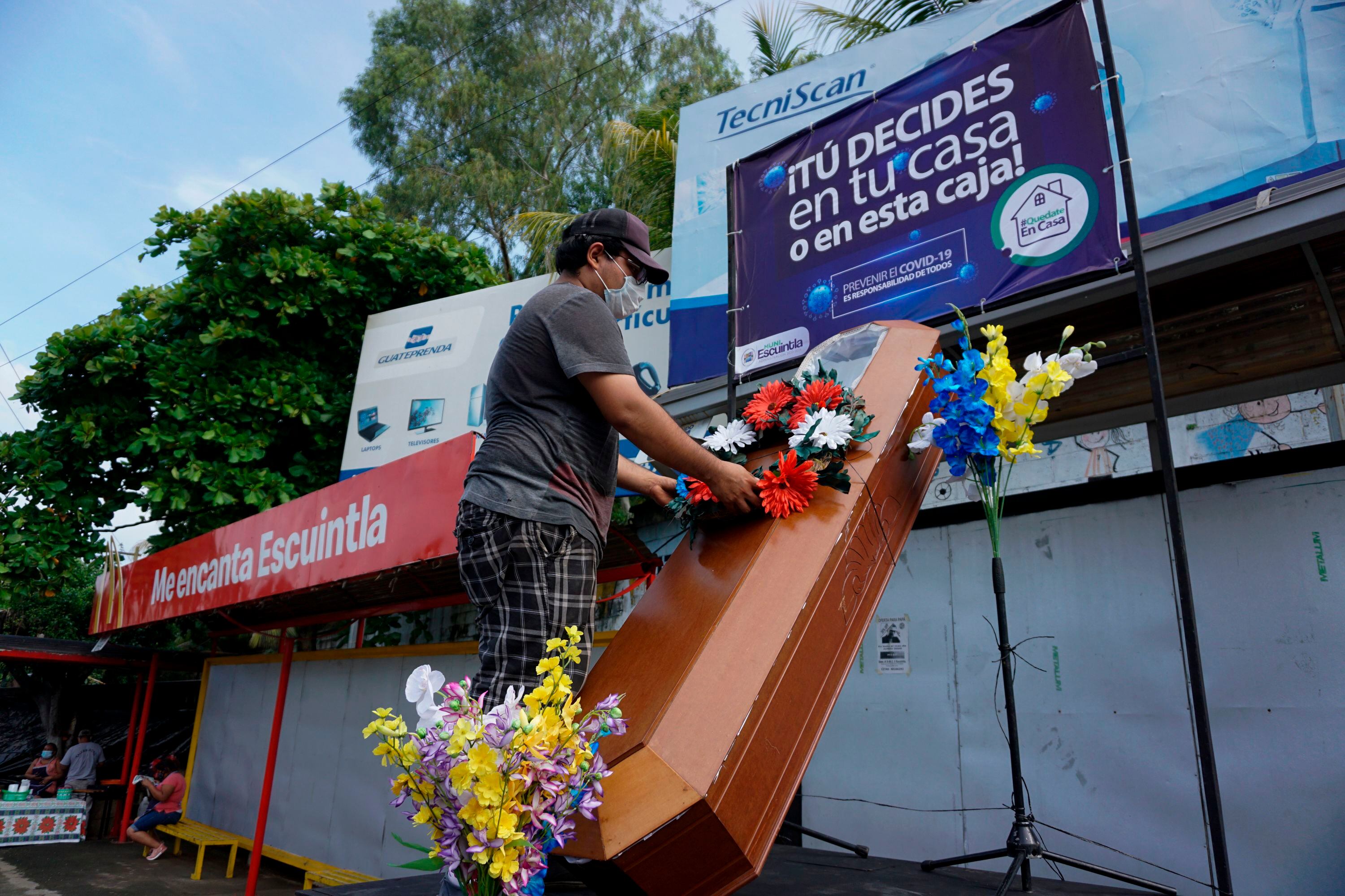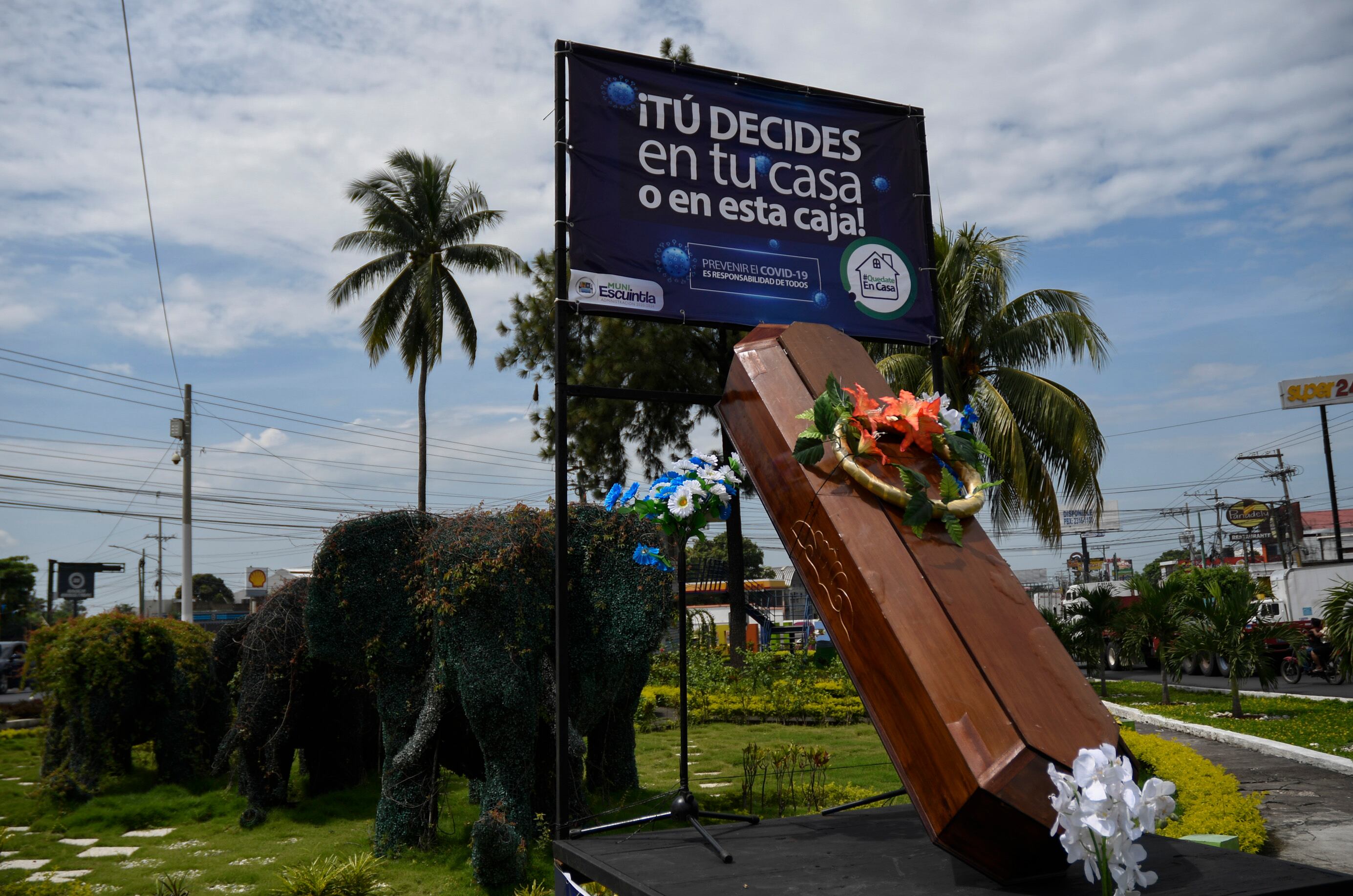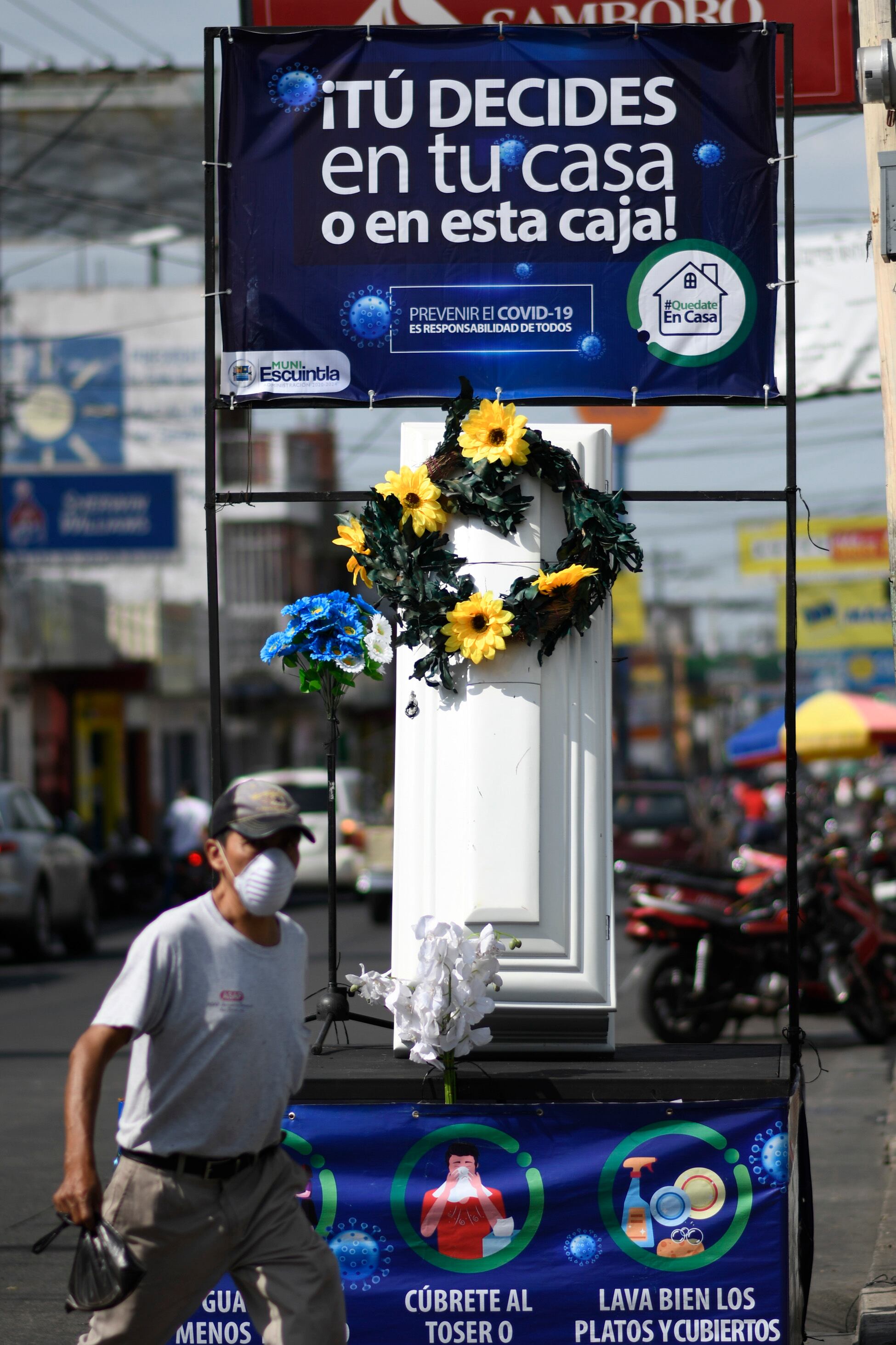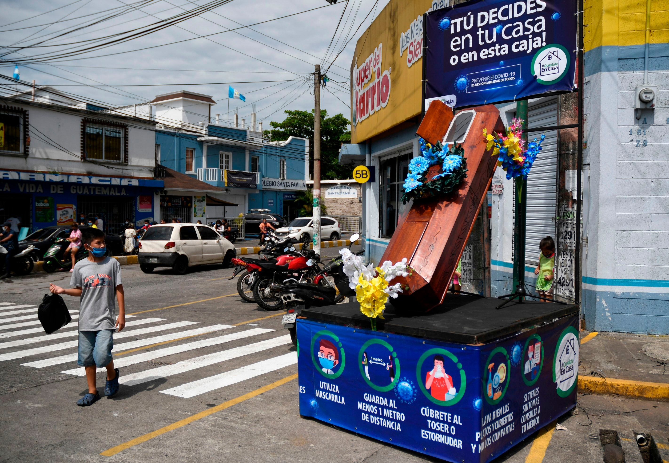 "¡Tú decides, en tu casa o en esta caja!", es la frase que corona cuatro ataúdes colocados en las calles del municipio guatemalteco de Escuintla en un intento desesperado de las autoridades locales por frenar la pandemia del coronavirus.