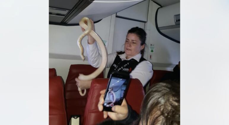 Las fotos muestran una víbora de color pálido y entre 1,30 y 1,60 metros enrollada debajo de un bolso. En otra foto, un asistente de vuelo la coloca en una bolsa de desperdicios.