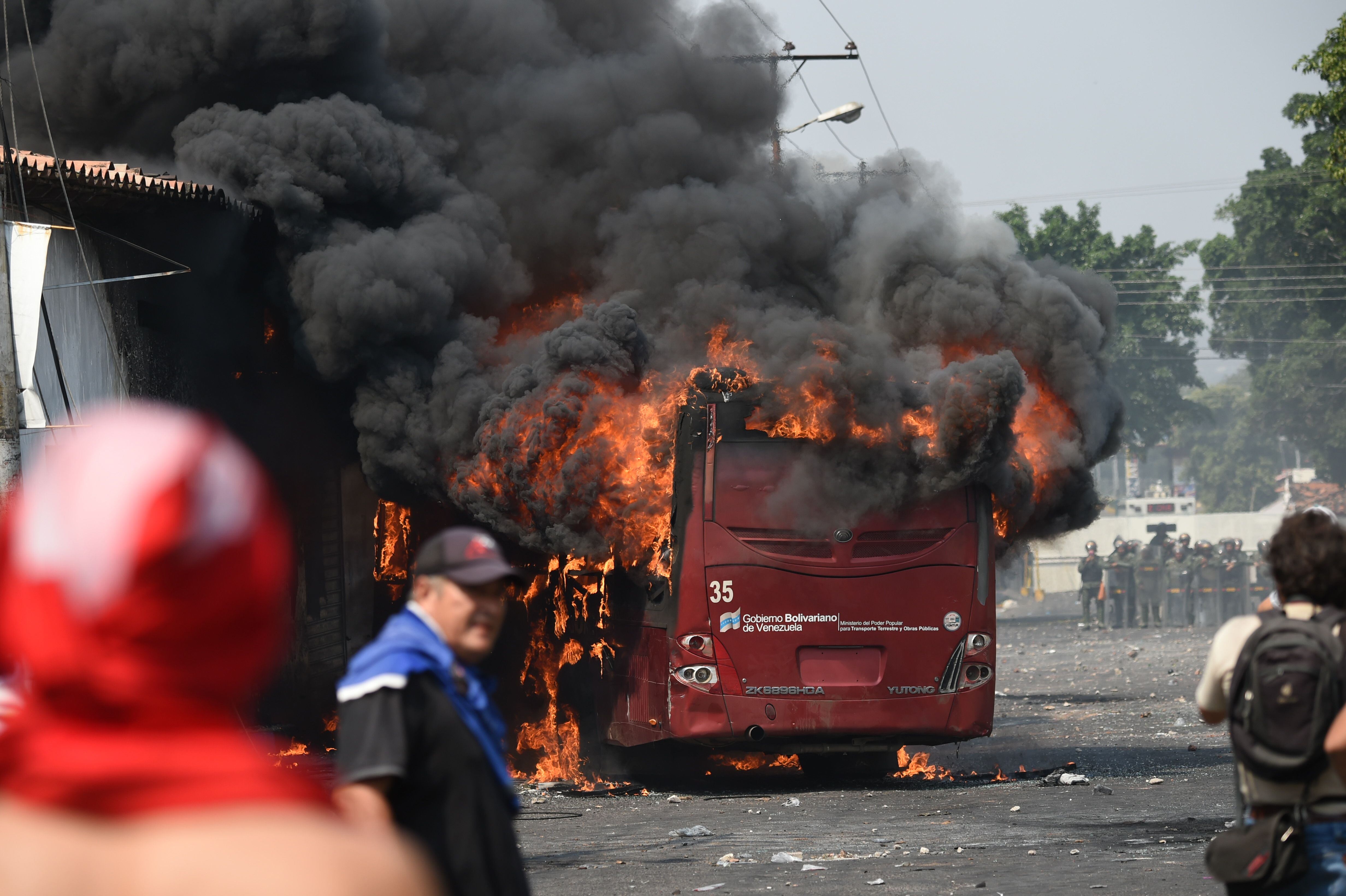 Dos camiones que transportan la ayuda fueron incendiados en el puente Santander, en Ureña, cuando intentaban avanzar una vez que los manifestantes quitaron las valles del puesto fronterizo. “Es un crimen de lesa humanidad”, dijo Guaidó.