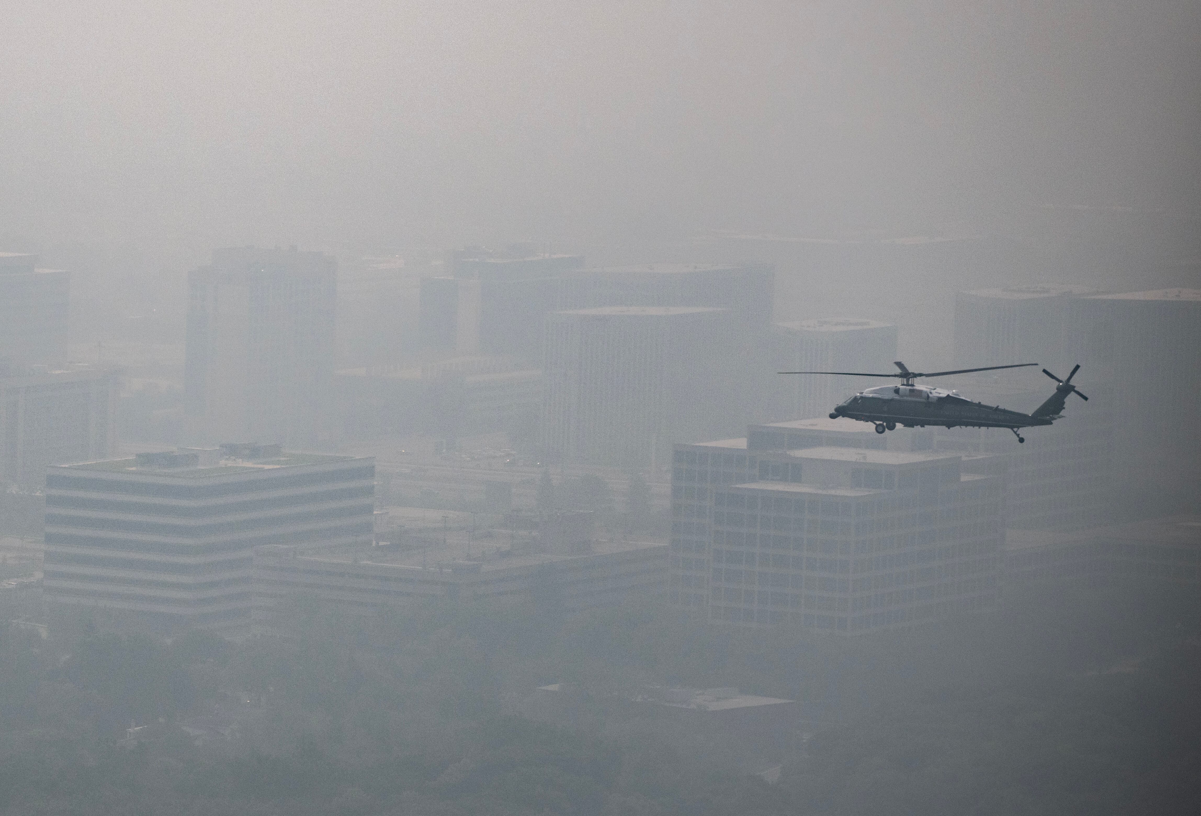 El Air Force One del mandatario aterrizó “a través de una espesa capa de humo y neblina”, según un informe de la Casa Blanca previo a su discurso.