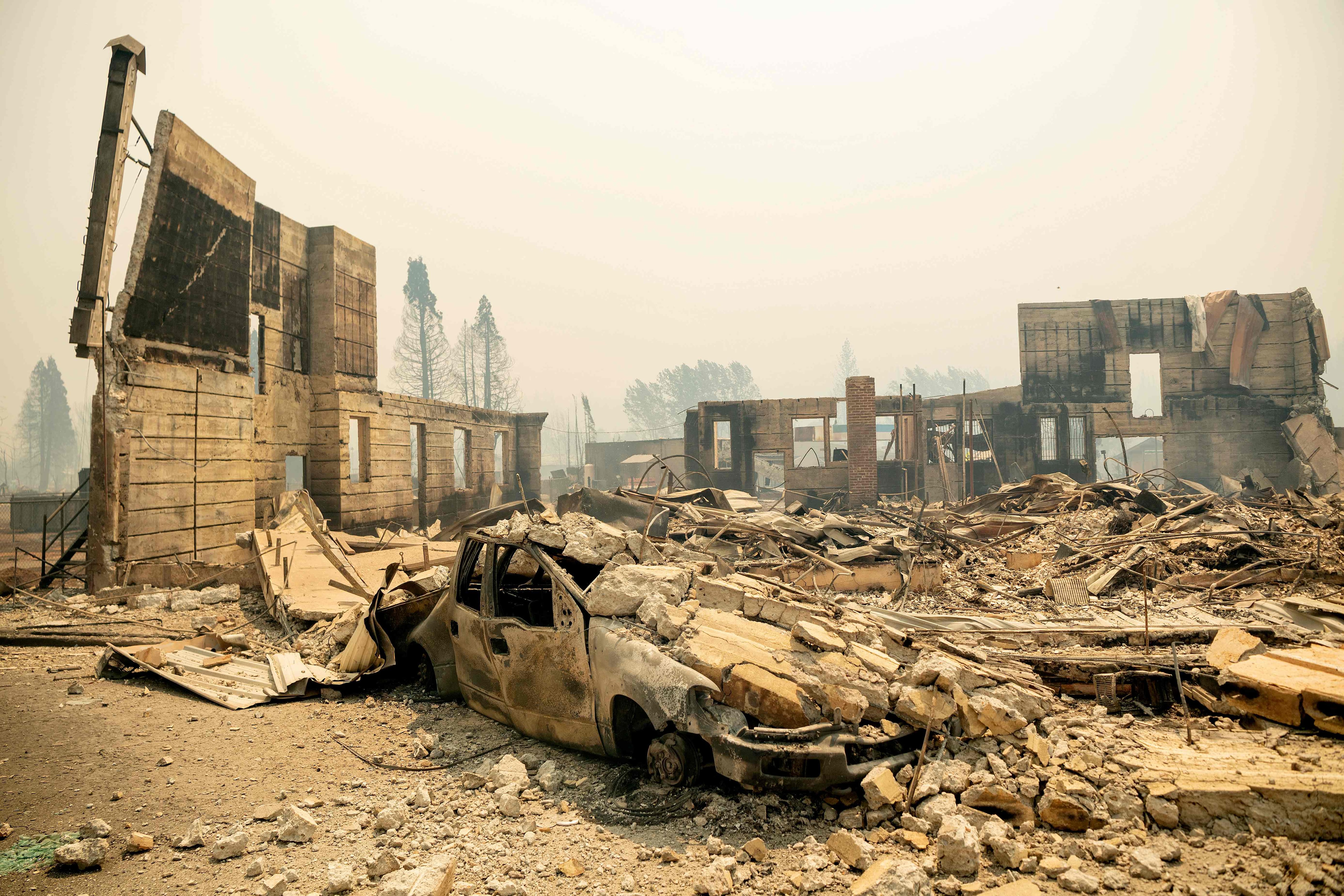 El centro de Greenville, una comunidad en el norte del estado, fue asolado por las llamas luego de que los fuertes vientos empujaran el incendio Dixie en esa dirección.