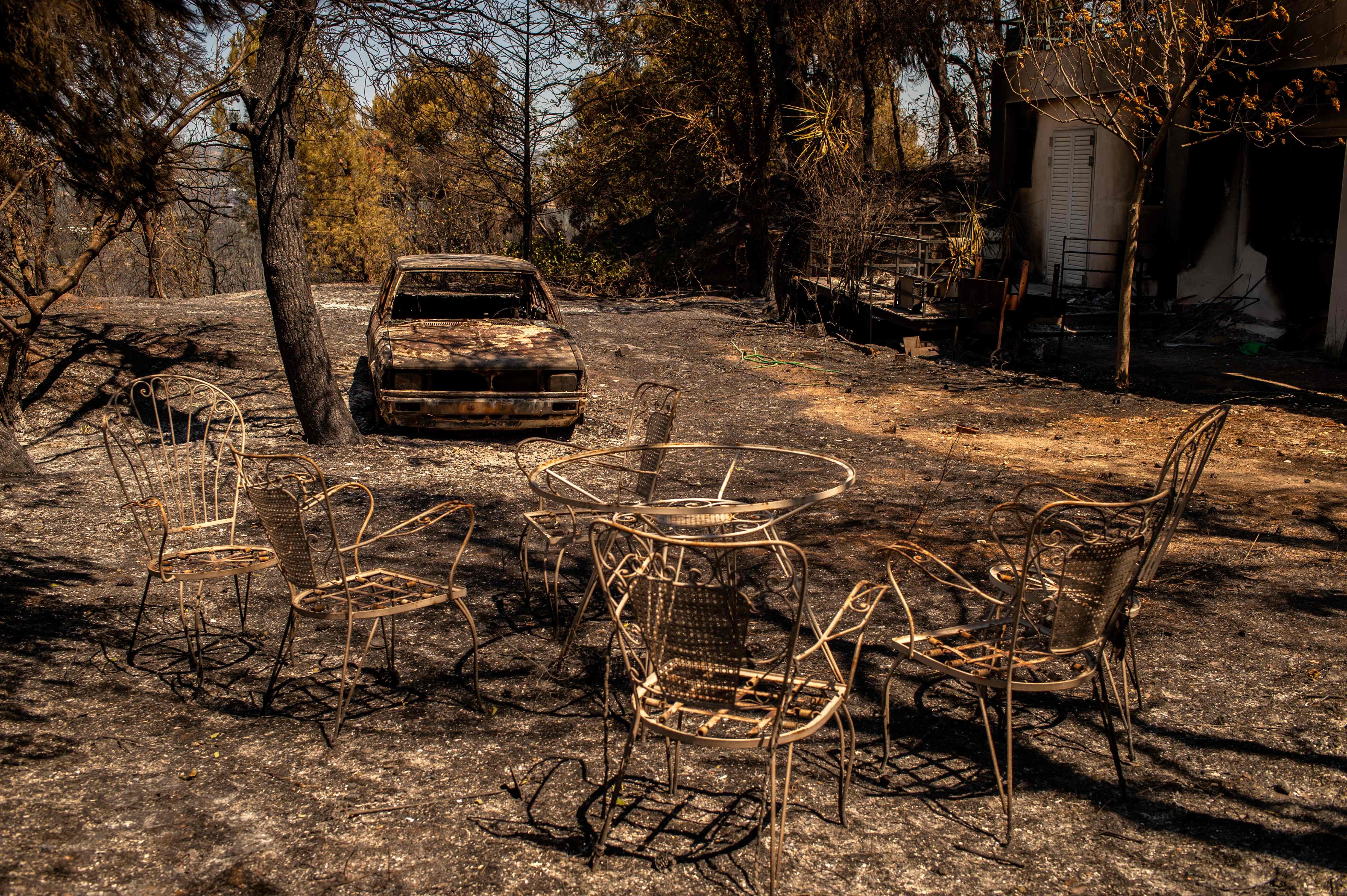 En el pueblo de Pefkofyto, cuyo nombre significa “bosque de pinos” en griego, solo quedan pinos carbonizados y los cimientos de las viviendas. El incendio no ha dejado más que un espectáculo de desolación.