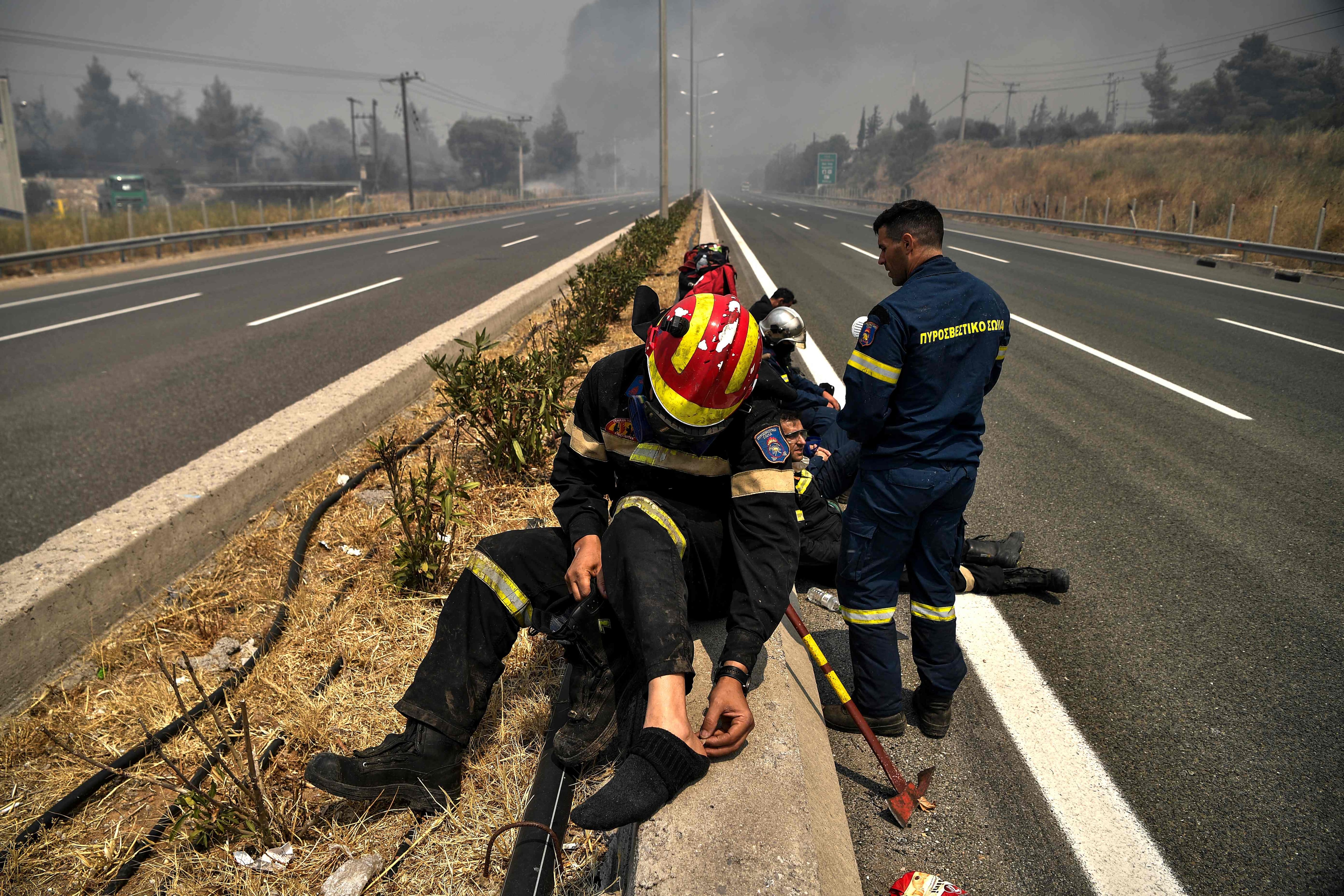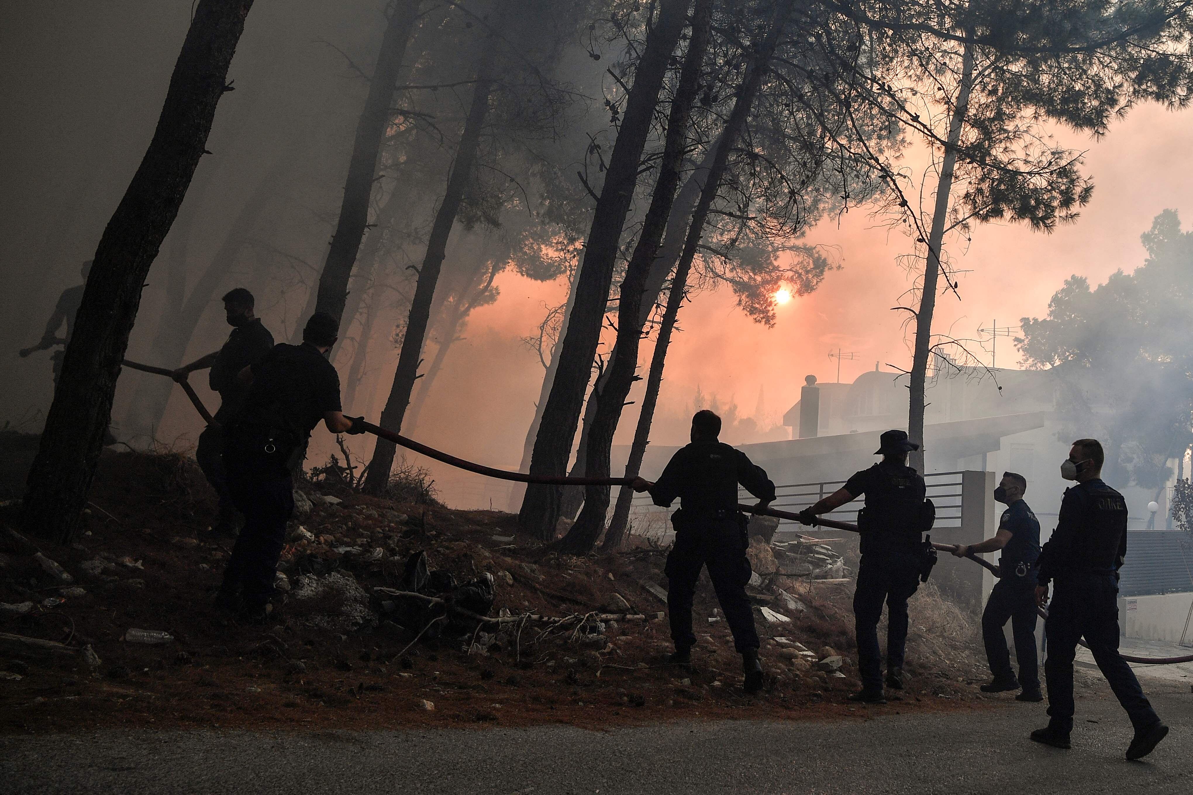 Más de 1.450 bomberos griegos continuaban una encarnizada batalla contra cinco grandes incendios al norte de Atenas, en la isla de Eubea, a 200 km al este de la capital, y tres fuegos en la península del Peloponeso, en el oeste.