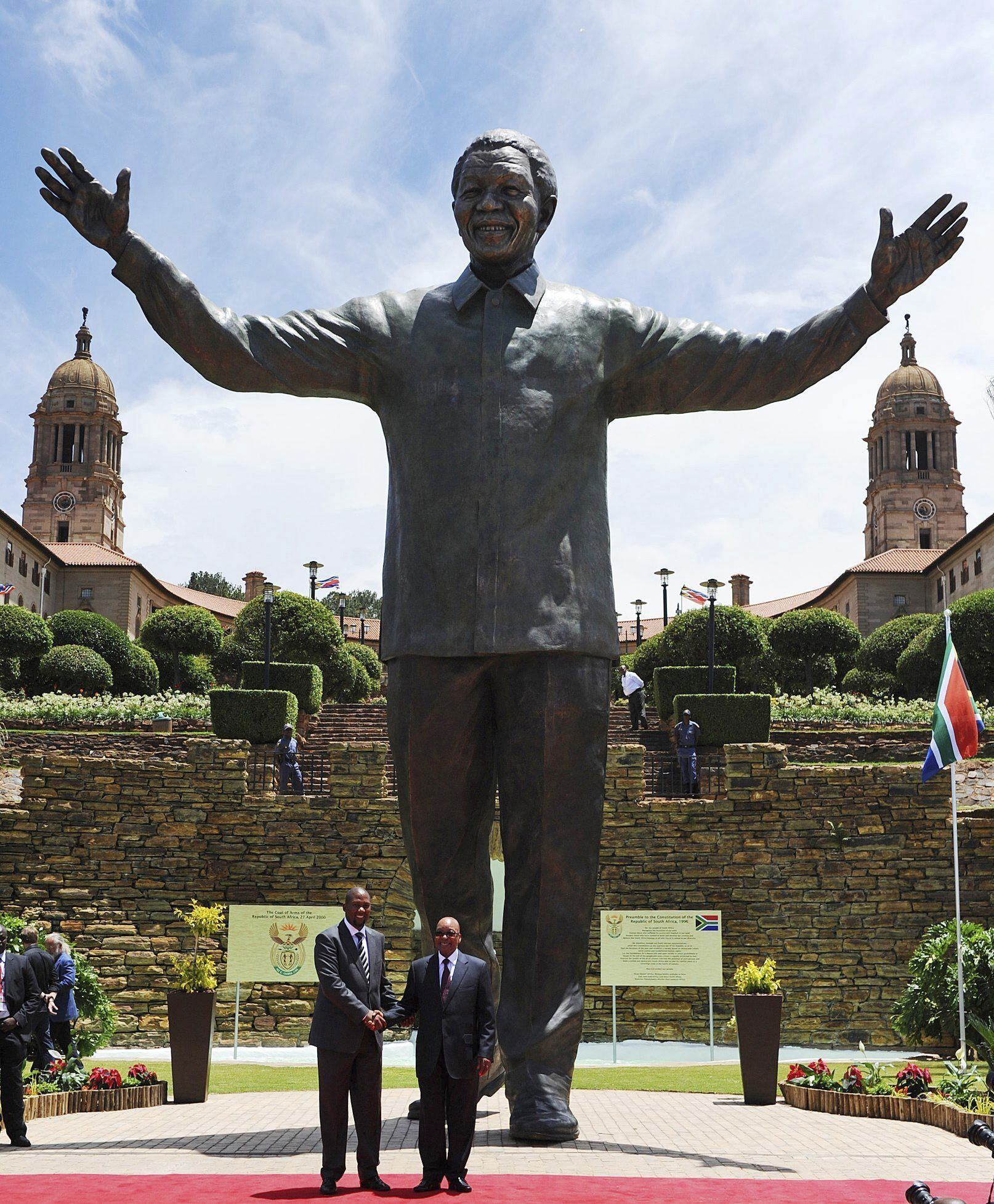 Durante su inauguración ante el Union Buildings, el presidente sudafricano, Jacob Zuma, pulsó un control remoto que no funcionó, por lo que unos trabajadores tuvieron que retirar a mano la tela que cubría la estatua, desvelando a un Mandela de 4,5 toneladas de bronce y nueve metros de altura.