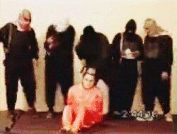 La cinta, de mala calidad, mostró a un hombre vestido con un traje naranja y sentado en una silla de plástico en una habitación vacía con cinco encapuchados detrás de él.