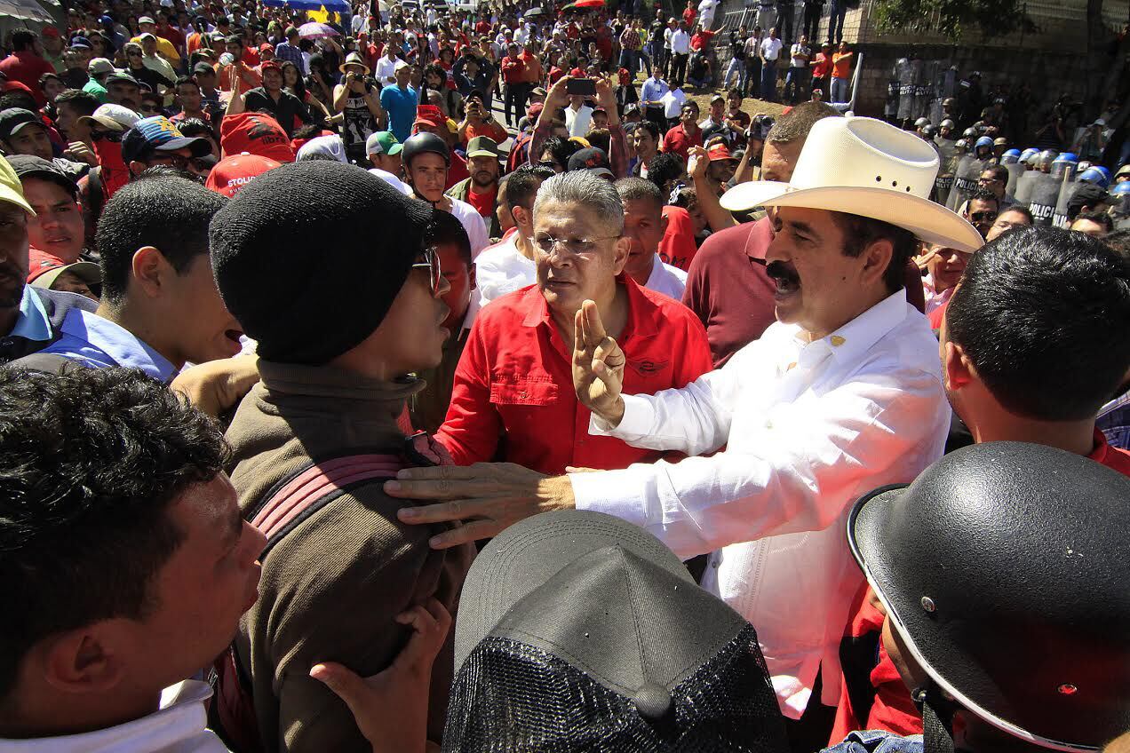 Ante la imposibilidad de continuar con su protesta, Zelaya se subió junto a otros dirigentes opositores a un vehículo descapotado, desde donde acusó al nuevo gobierno de reprimir la libertad de expresión.