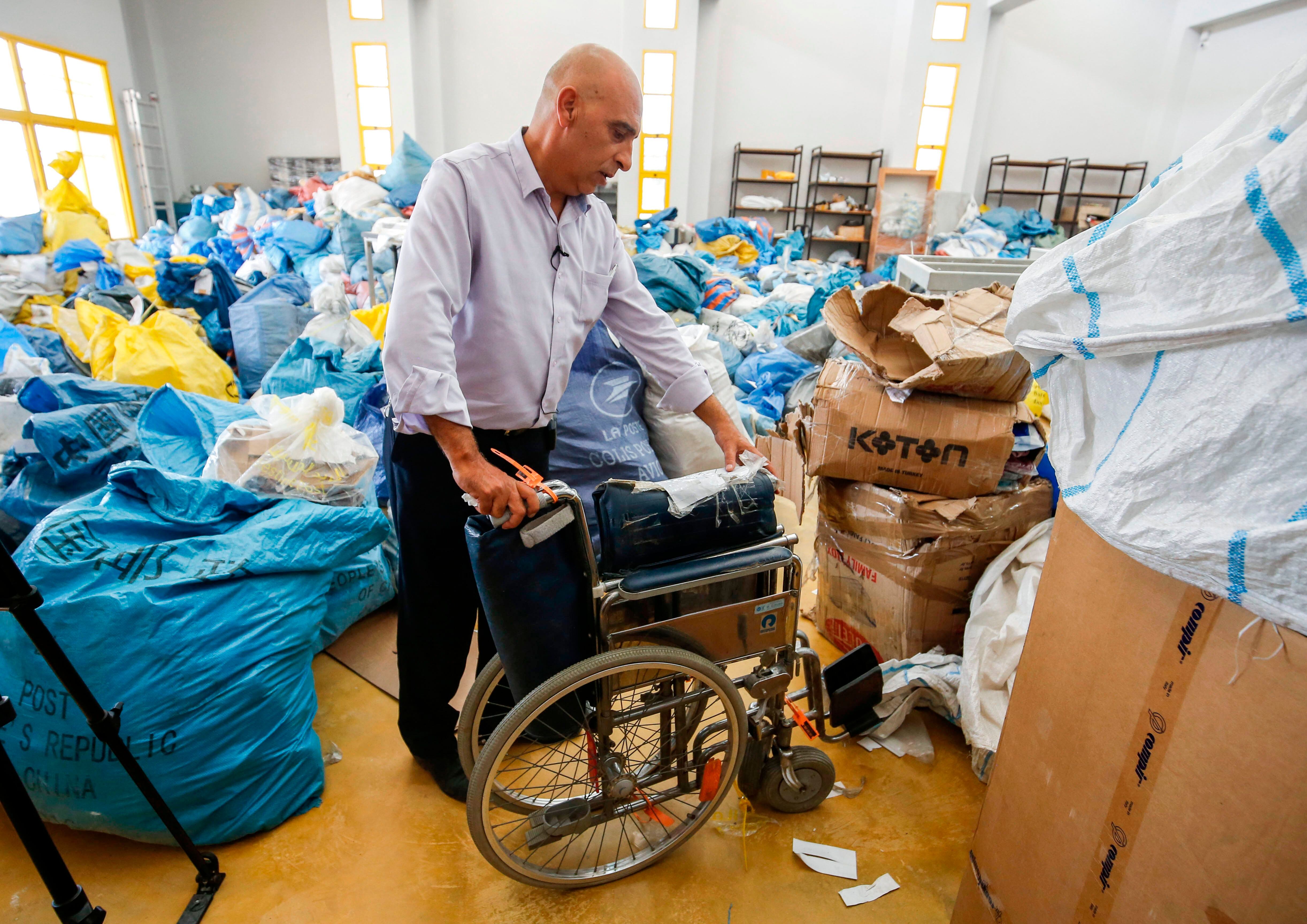 Entre los diversos objetos hay una silla de ruedas enviada en el 2015 desde Turquía con destino a la franja de Gaza. Otros muchos artículos fueron comprados por internet por ciudadanos palestinos.
