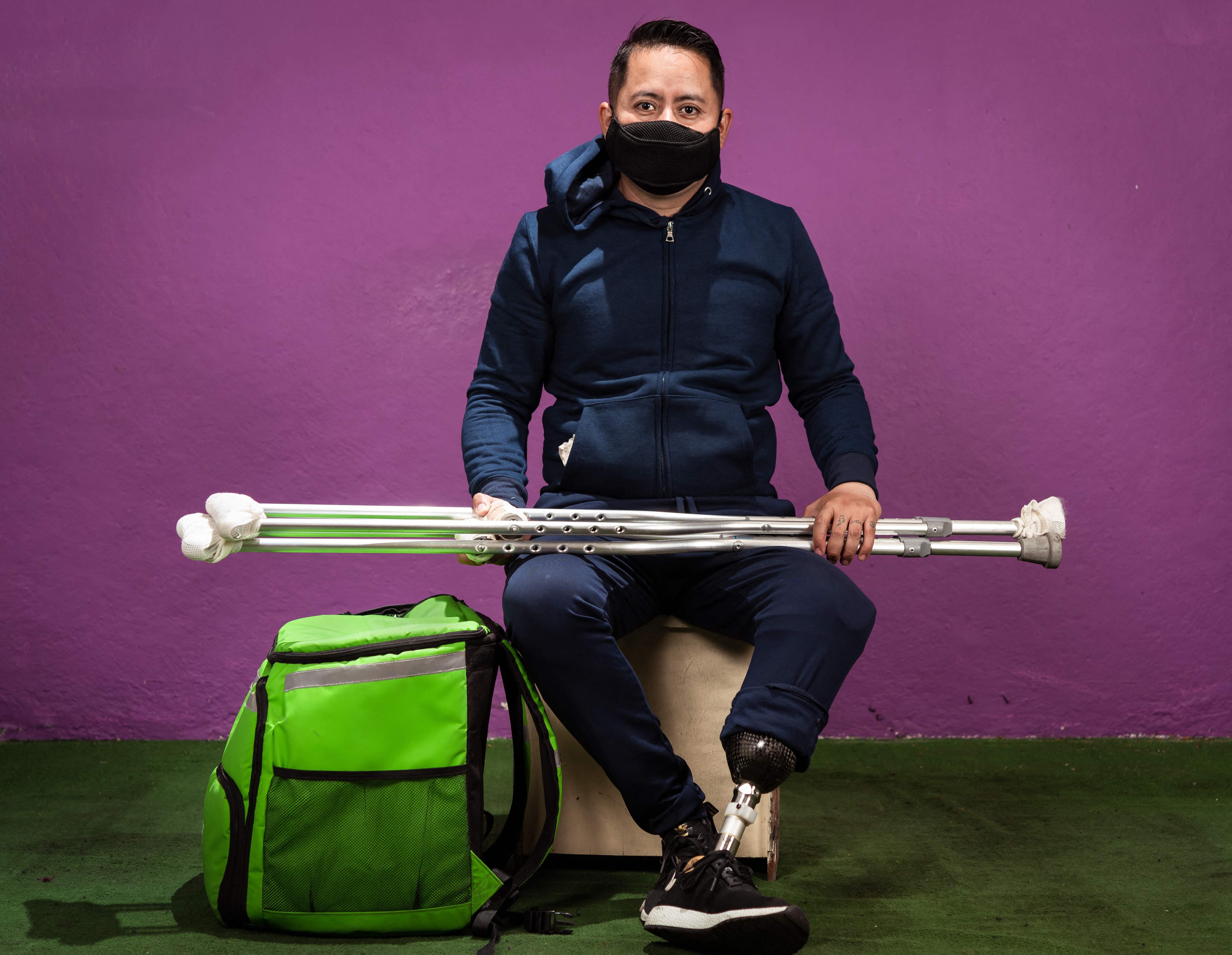 En Ciudad de México, con muletas y una prótesis en la pierna izquierda, Víctor, de 33 años, sigue llevando comida a domicilio tras sufrir el 13 de diciembre del 2020 un accidente que resultó en una amputación a nivel de la rodilla.