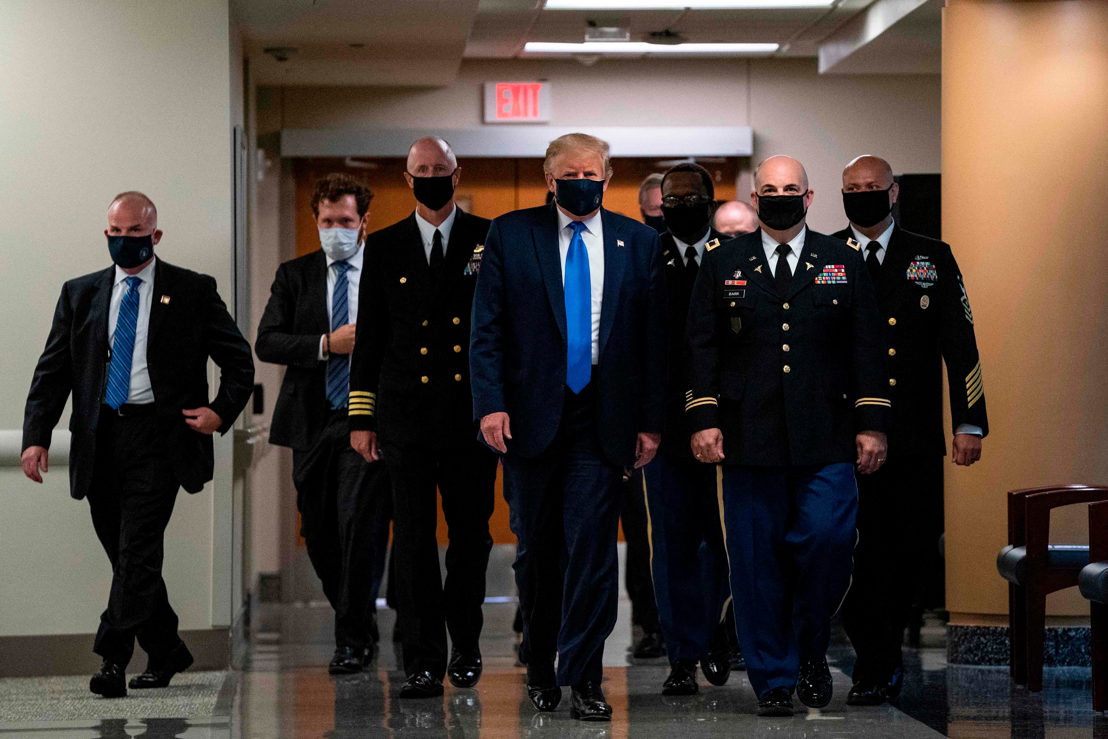 Trump usó una mascarilla negra mientras caminaba por los pasillos del hospital militar Walter Reed, en las afueras de Washington, para reunirse con veteranos heridos, según las imágenes de la cadena informativa CNN.