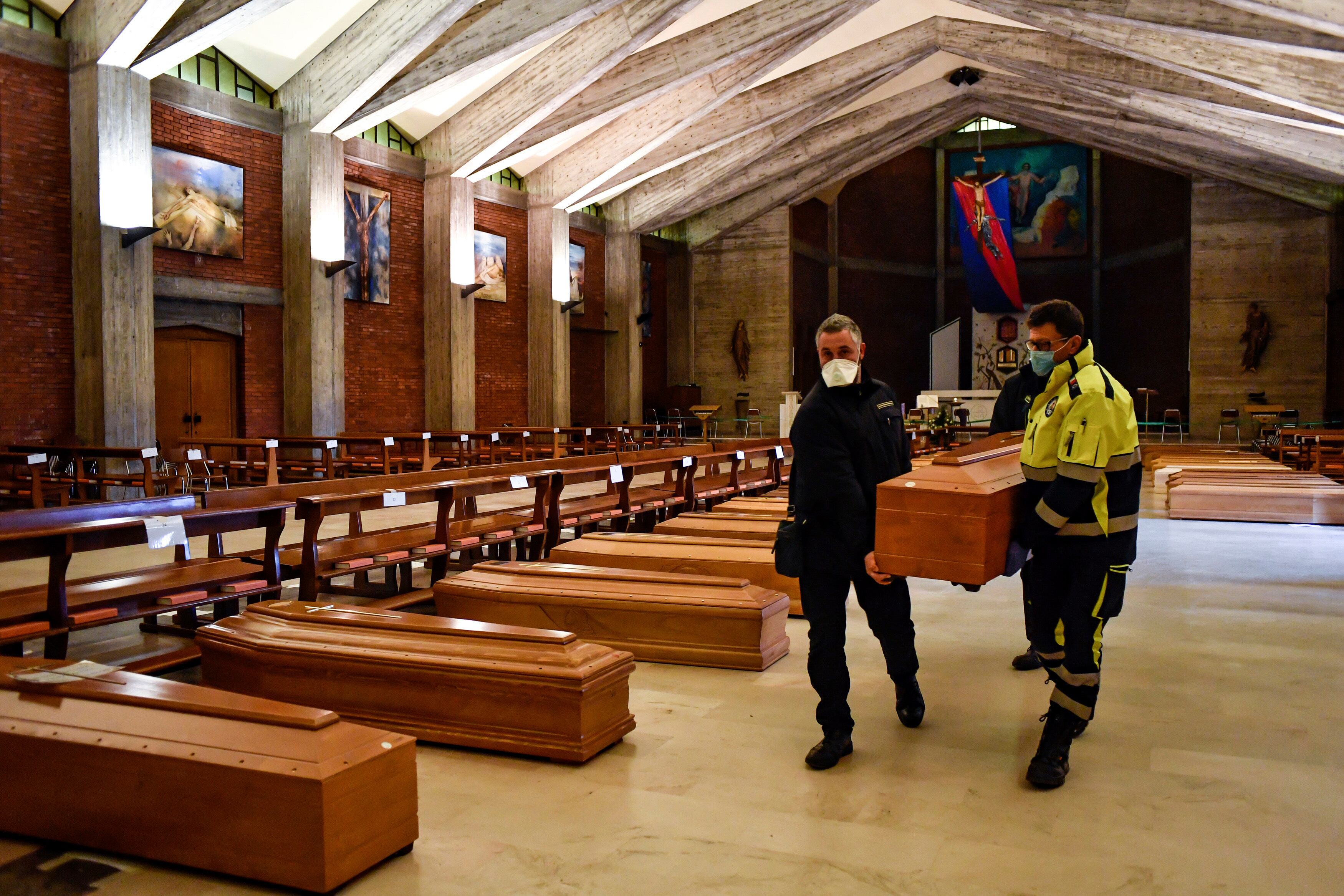 En Bérgamo, otra ciudad mártir, conmovió la imagen de los convoyes militares que a diario atraviesan la ciudad para transportar cadáveres a otras regiones donde puedan ser incinerados debido a que el cementerio no tiene capacidad, como constató un fotógrafo de la AFP.