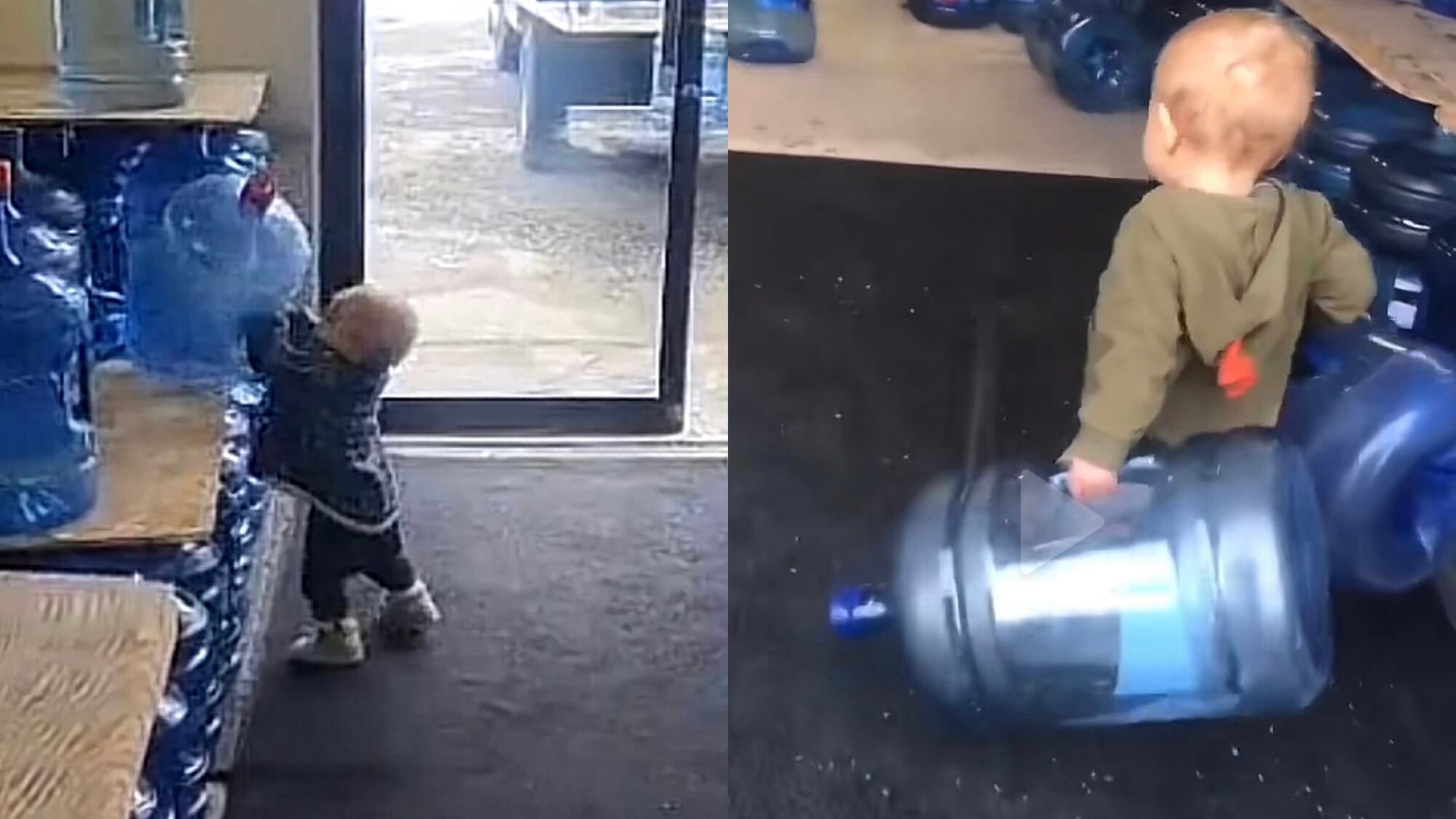 Su mamá compartió el viernes 10 de febrero el video donde se aprecia al bebé jugando con uno y hasta dos garrafones de agua vacíos a la vez, apilándolos con mucha precisión sobre unas tarimas.