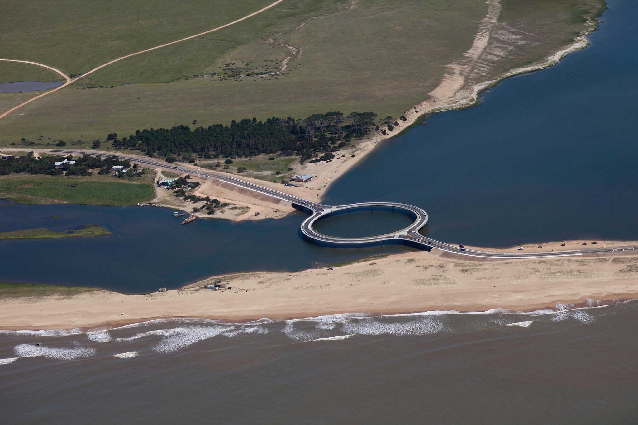El puente de la Laguna Garzón, inaugurado en diciembre delaño anterior, tiene 51,5 metros de radio y 323 de largo y puede cruzarse encarro, bicicleta y a pie, publicó el diario Clarín de Argentina.