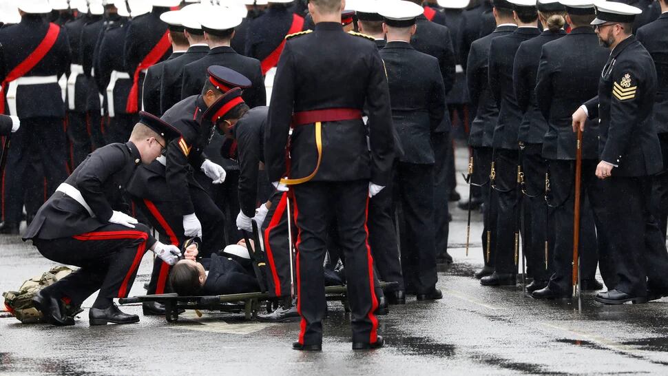 Uno de los hombres que se desvaneció, de acuerdo con Daily Mail, pertenece a la Marina Real. Imágenes capturadas por los fotógrafos en el lugar evidencian que tras su caída, el soldado fue retirado de la procesión en una camilla para recibir asistencia médica.