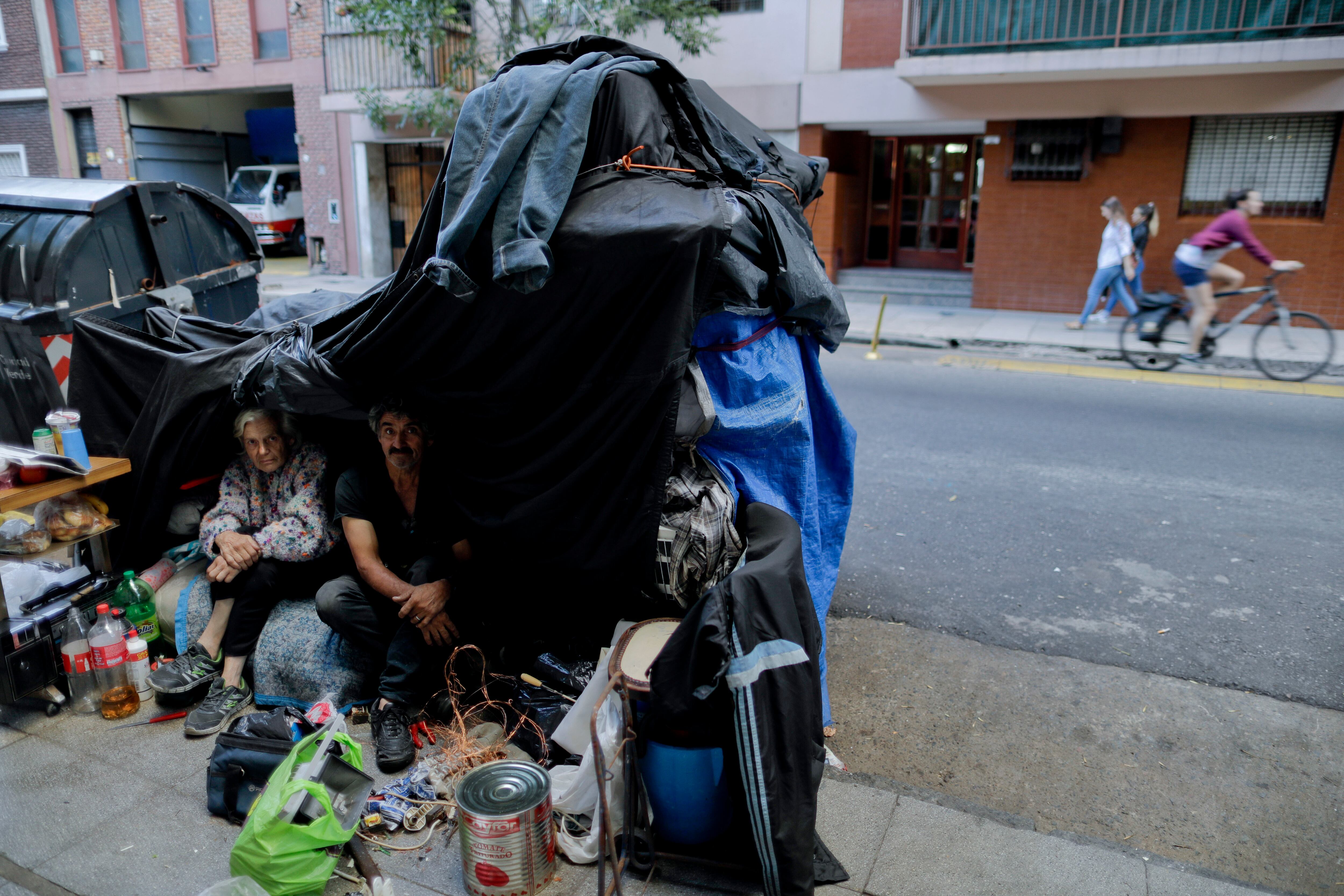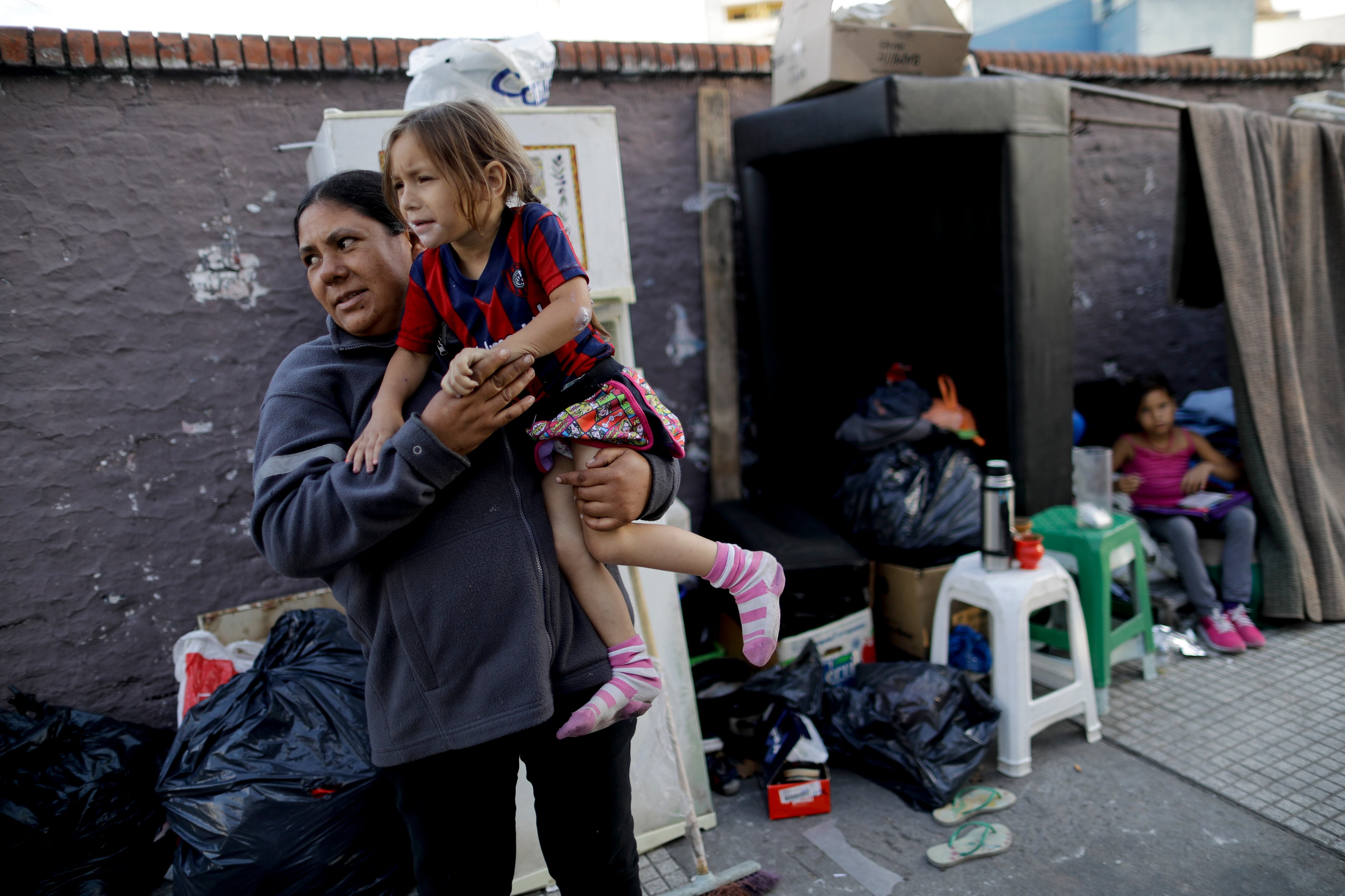 Una tienda improvisada con paredes de cartón, techo de bolsas y dos colchones instalada a un costado de una transitada avenida de la capital argentina aloja a la niña de dos años, sus cuatro hermanos y sus padres desde hace ocho meses, cuando los ingresos de la familia ya no fueron suficientes para cubrir un alquiler al ritmo de la galopante inflación en Argentina.