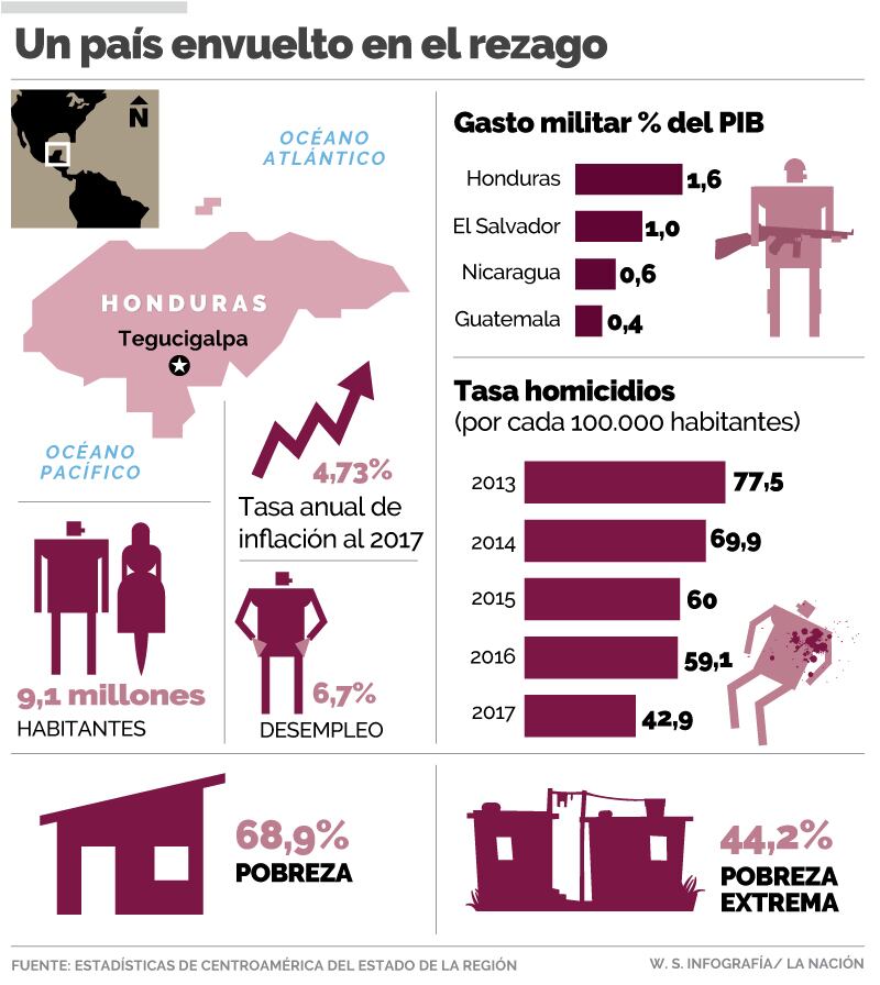 Siete de cada diez personas se encuentra en situación de pobreza en Honduras, según cifras del Estado de la Región. Mientras que el empleo informal ronda el 70%. Además, en 2017 se reportaron 43 homicidios por cada 100.000 habitantes. En Costa Rica, la tasa es de 12 por cada 100.000.