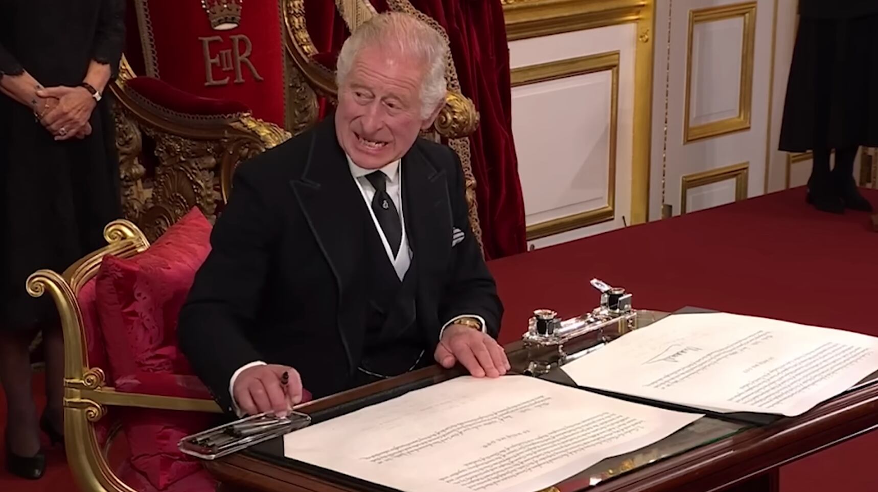 Las imágenes difundidas mostraron al nuevo rey enfadado con una pluma utilizada para firmar en el libro de honor que parece perder tinta. “¡Oh, dios, lo odio! (...) No puedo soportar esa maldita cosa”, dice el monarca, reputado por su carácter caprichoso.