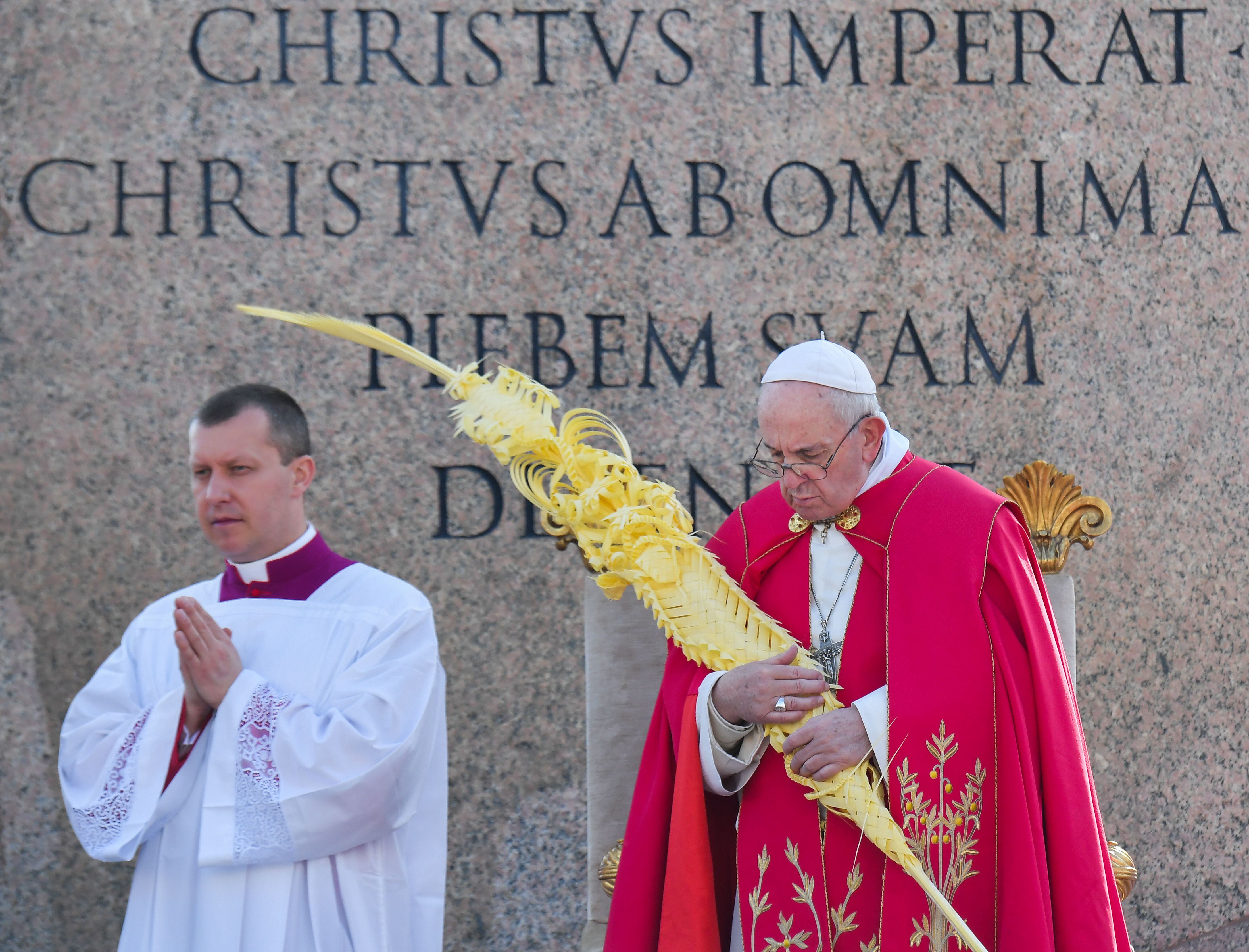 El papa bendijo con agua bendita las ramas de palma y olivo que sostenía los asistentes a la misa del domingo. Desde los escalones al pie del obelisco en el centro de la plaza, observó mientras los prelados formaban un círculo a su alrededor mientras sostenían palmas trenzadas.