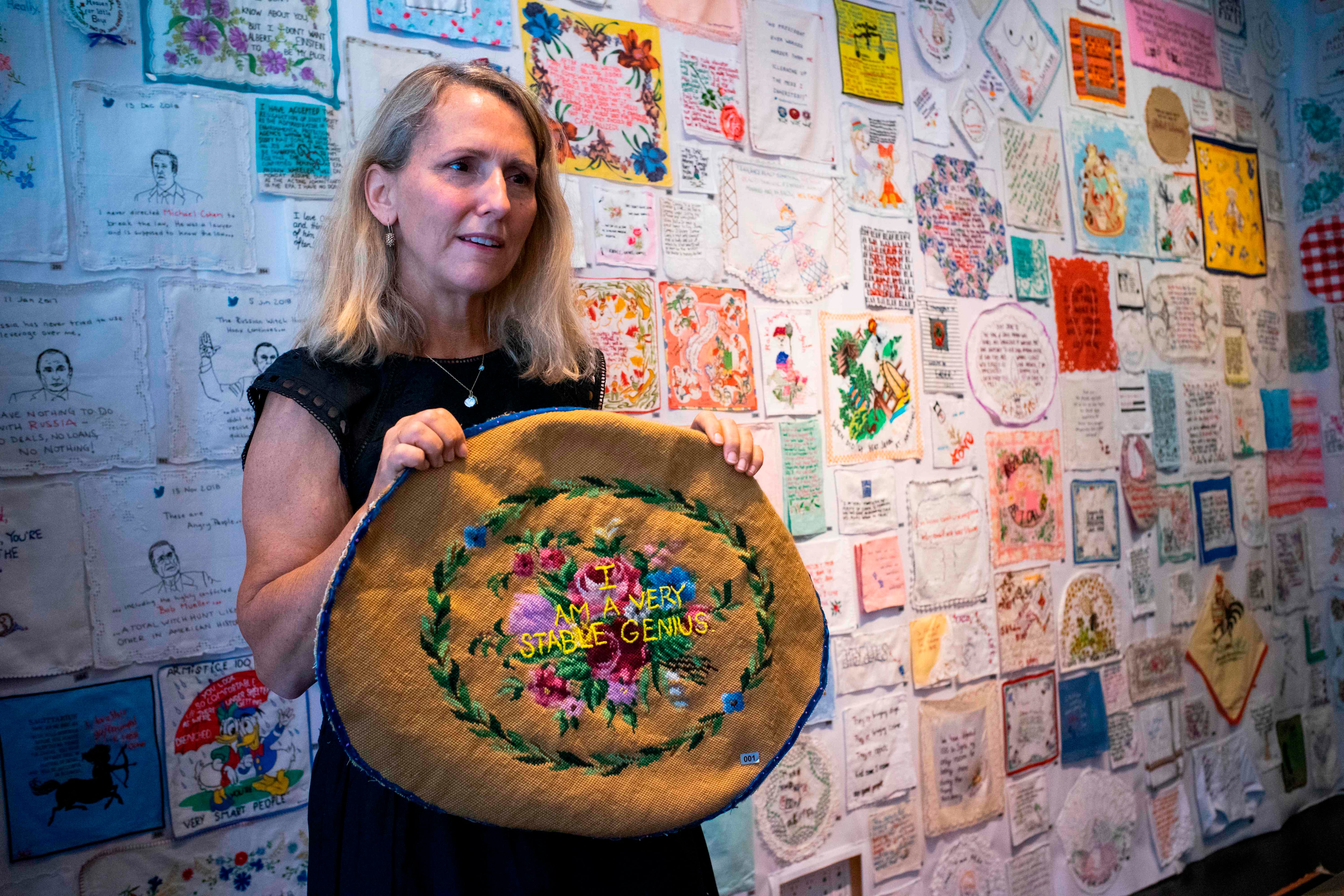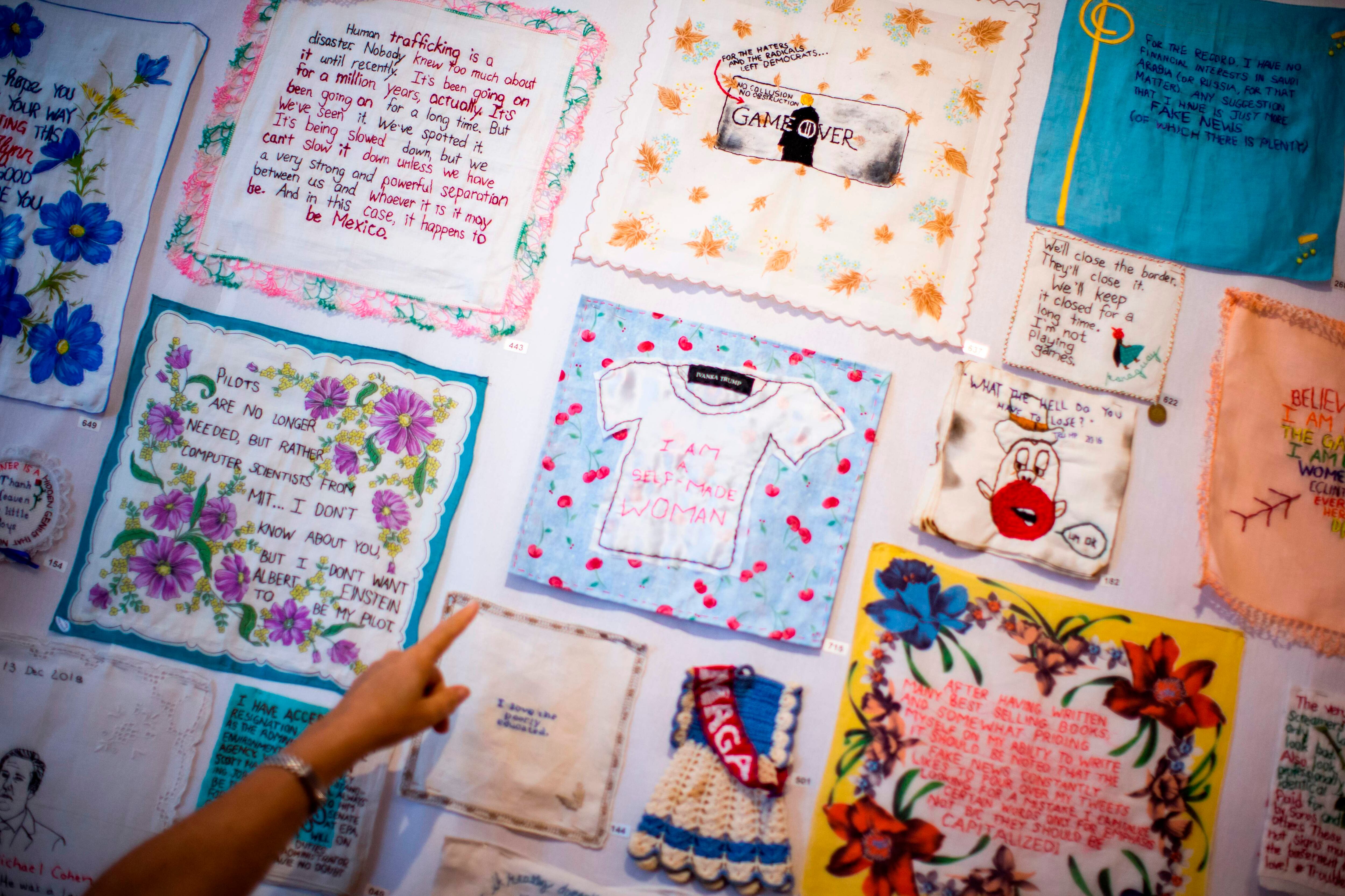 Una artista estadounidense encontró una manera noble de registrar los comentarios más extravagantes del presidente Donald Trump: bordándolos en viejos tejidos como manteles, baberos e incluso ropa interior.