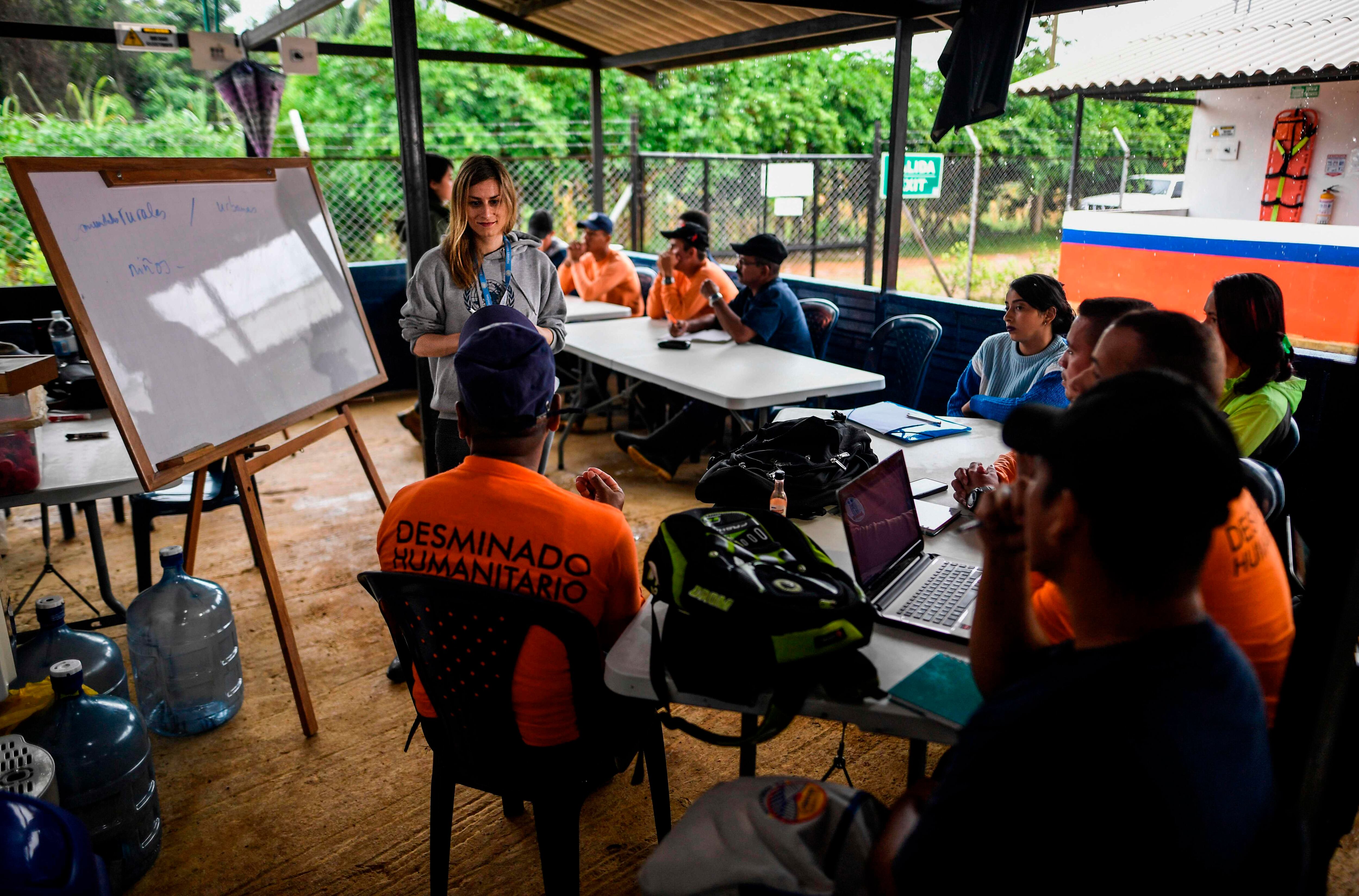 Ahora, acoge la base de Humanicemos DH (DH por derechos humanos), una ONG creada “por y para excombatientes” que quieren reincorporarse como desminadores profesionales, precisa su dirigente, la excomandante Ángela Orrego, de 50 años.