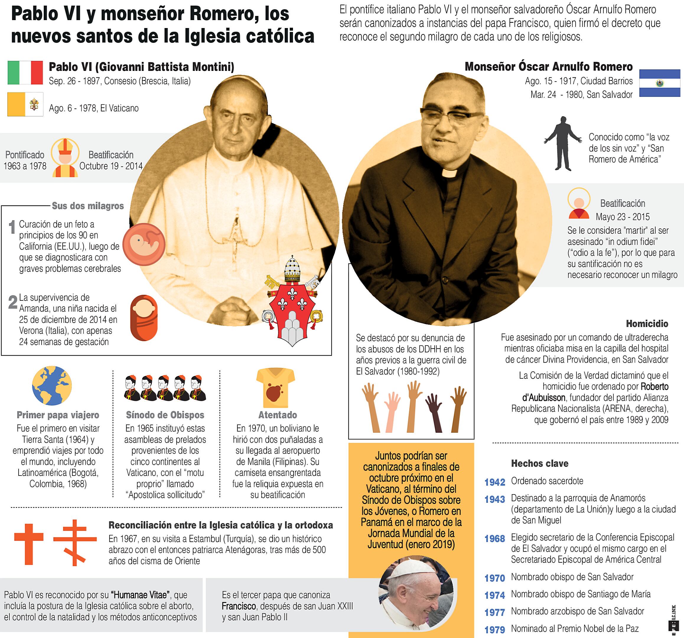 El Vaticano comunicó que Francisco firmó los decretos que permiten la canonización del papa Pablo VI (1963-1978) y de Romero, que por defender a los pobres fue calificado como “la voz de los sin voz”.