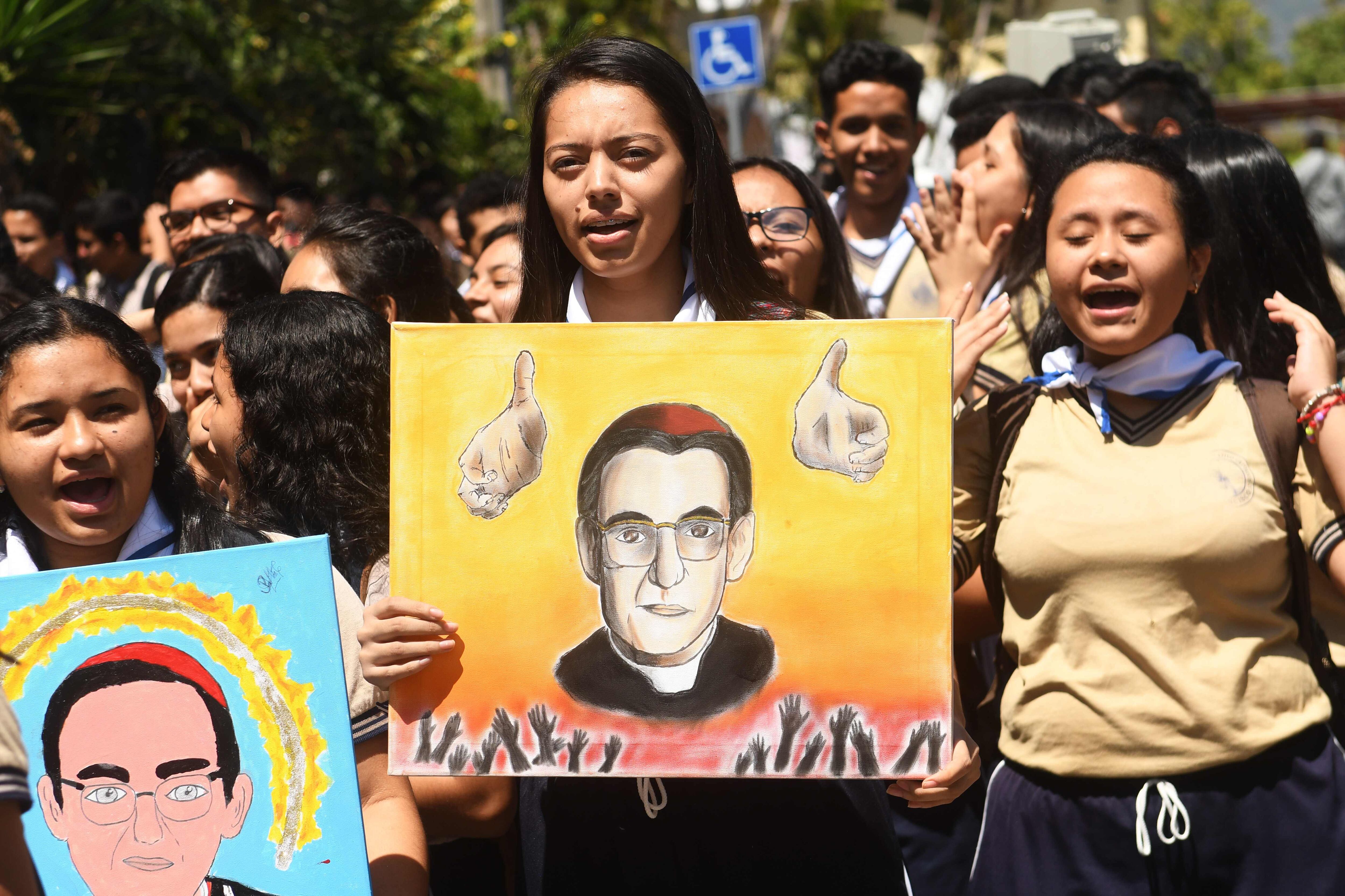 En tanto, René Martínez, de 16 años, uno de los estudiantes que animadamente cantaba a Romero, portó un cartel con un dibujo del rostro de su santo.