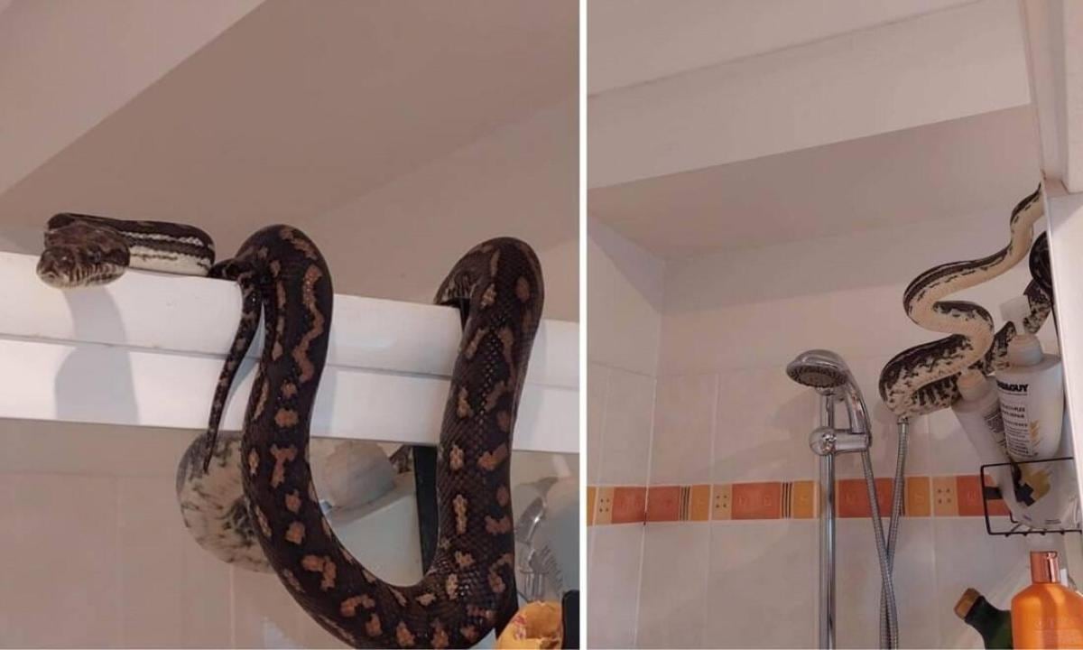 Tremendo susto se llevó un hombre en Queensland, Australia, cuando vio una serpiente pitón de seis metros de largo reptando en el techo de su baño. El sujeto se encontraba sentado en el inodoro cuando notó que el gran reptil estaba sobre la puerta de la ducha.