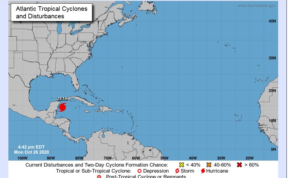 El Centro Nacional de Huracanes de Estados Unidos (NHC) dijo en un reporte que Zeta se encuentra a 170 km al sureste de la isla mexicana de Cozumel con vientos máximos sostenidos de 130 km/h.