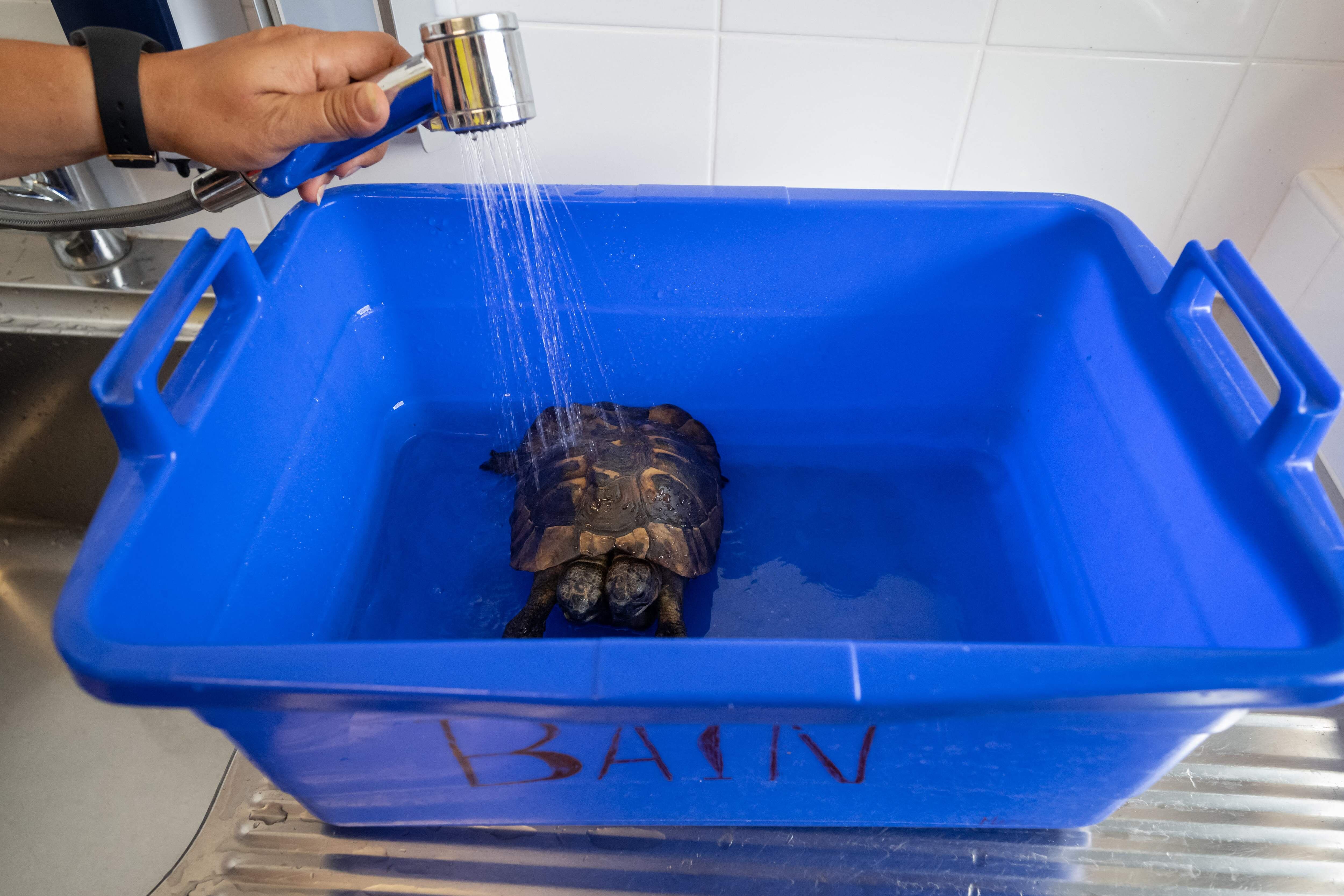 Dos cuidadores se turnan para dar a Janus su baño diario, sus comidas y para que haga ejercicio. Esta tortuga griega macho tuvo que ser operada recientemente de un cálculo en la vejiga. La inusual intervención se llevó a cabo en el Tierspital de Zúrich y fue objeto de un simposio.