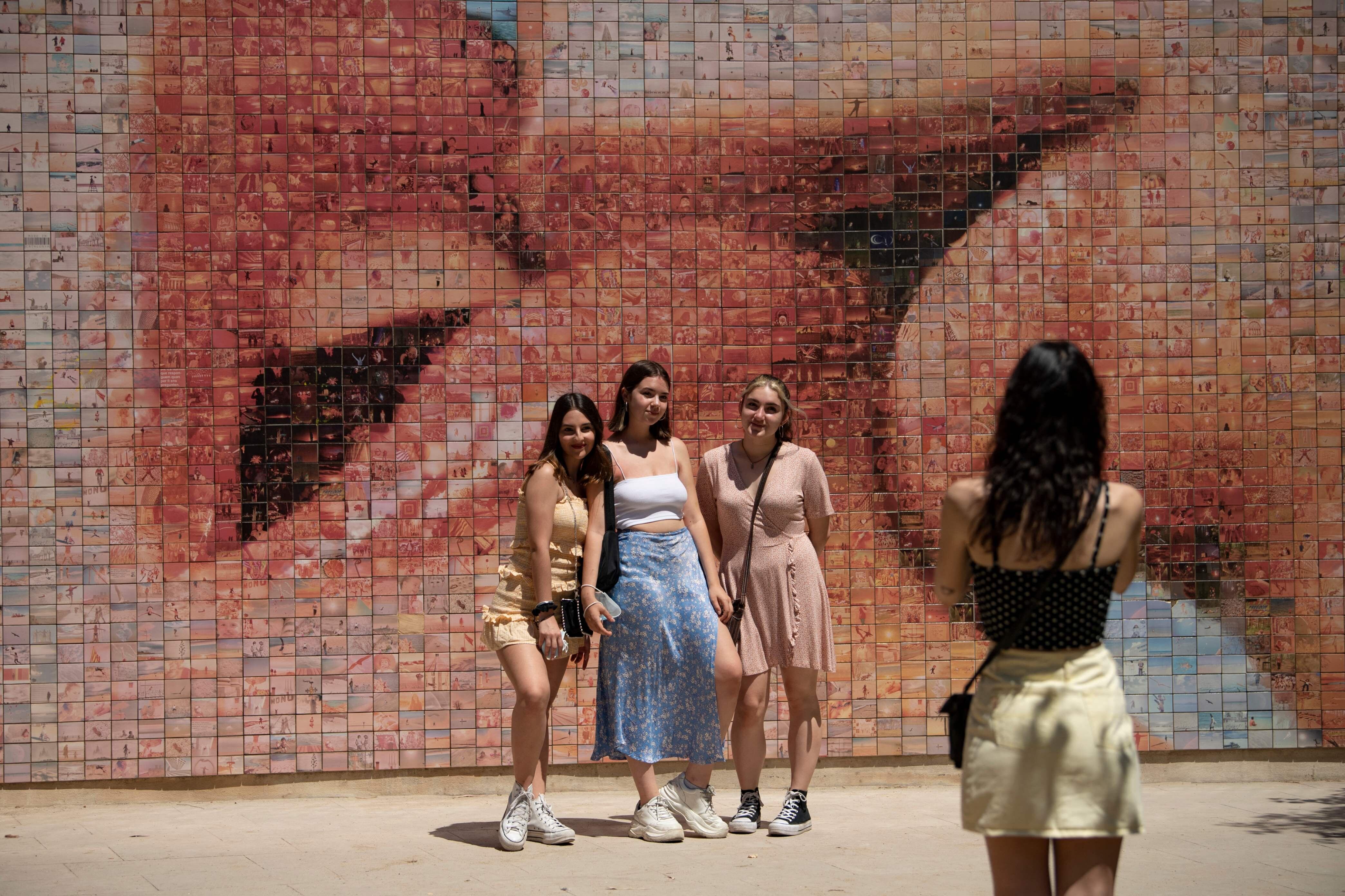 Ella y su esposo están entre las pocas personas que caminaban en la concurrida plaza sin mascarilla, bajo un cielo azul de inicios de verano.