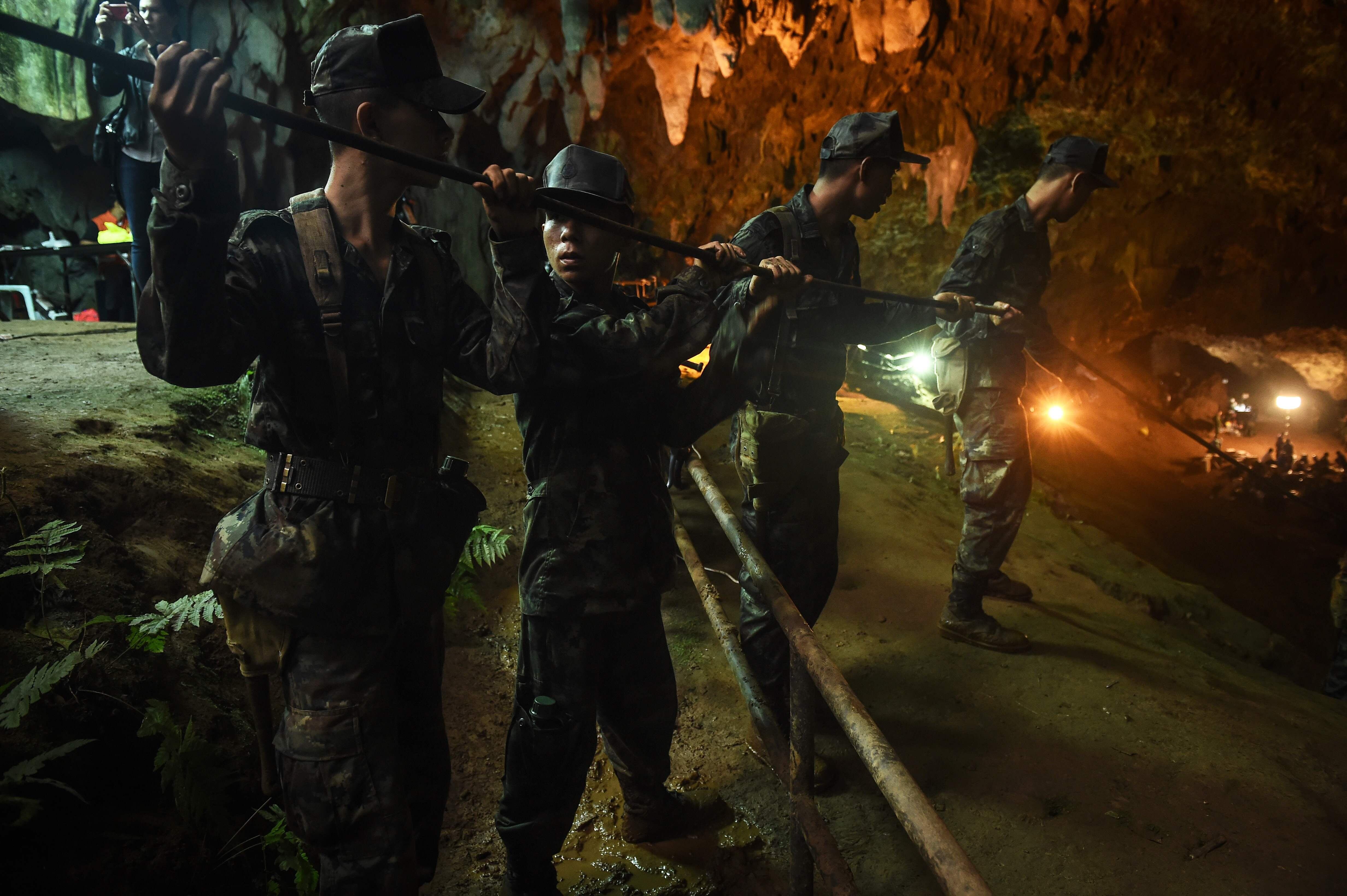 Por la tarde, miembros del Ejército comenzaron a construir un embalse para evitar la entrada del agua que cae de la montaña y sigue inundando la cueva, según un responsable de la región.