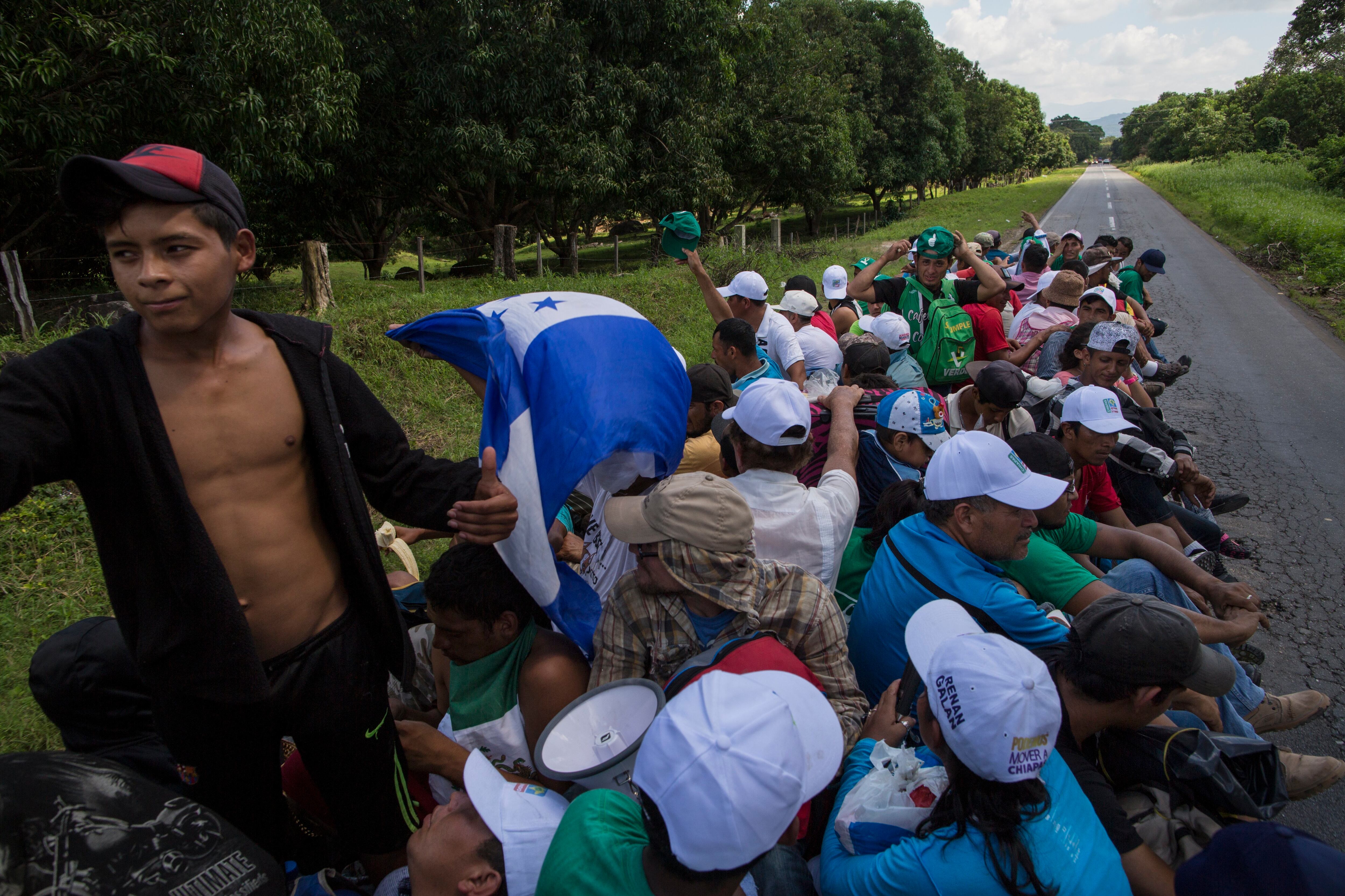 Acacoyagua, México. Miles de migrantes hondureños que cruzan México en caravana, decididos a llegar a Estados Unidos, reanudaron su marcha este miércoles en un trayecto que se estima durará 12 horas y que se suman a los 11 días de caminata acumulados hasta el miércoles.