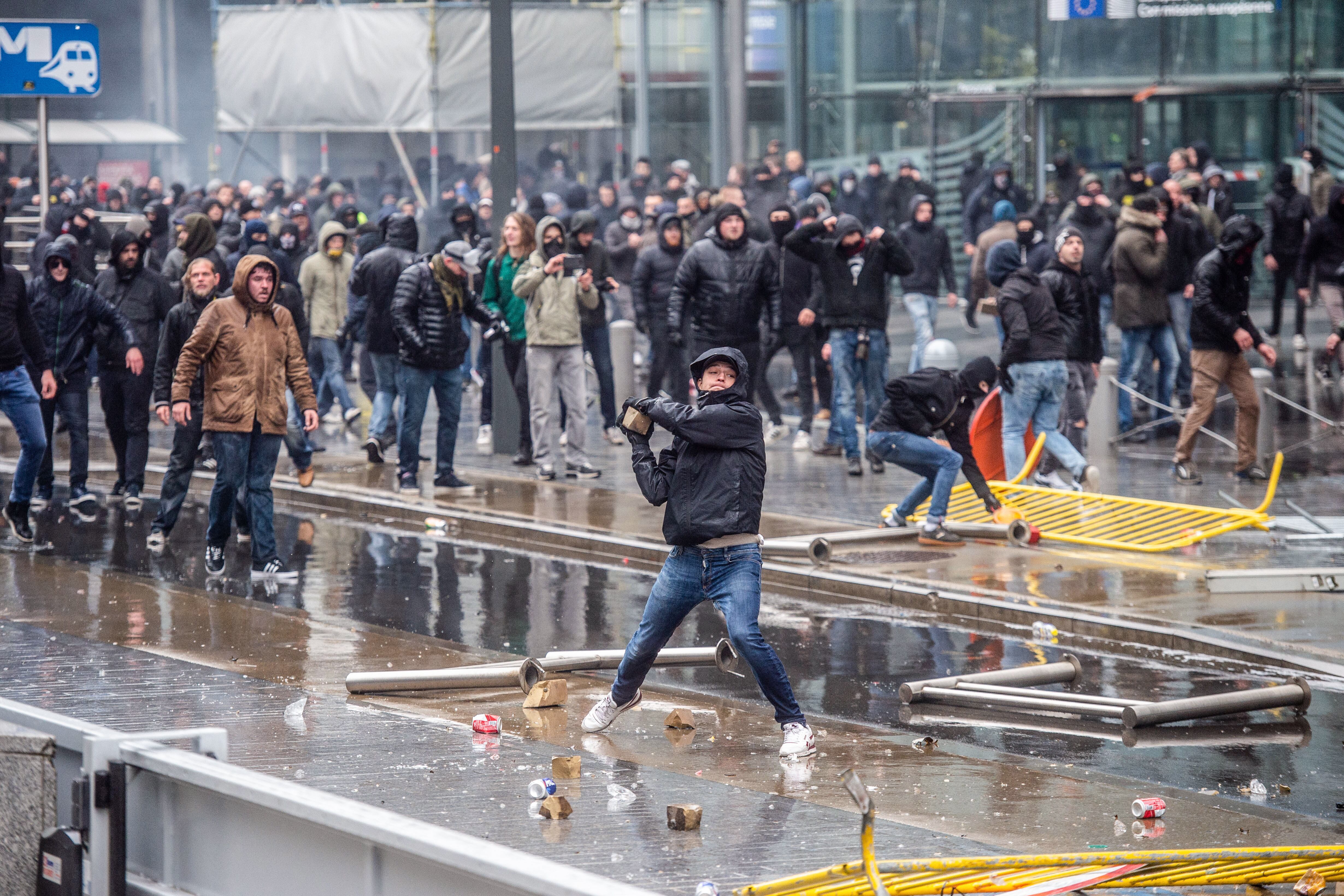 Tras un inicio en calma, los manifestantes comenzaron a lanzar proyectiles contras las fuerzas del orden y las fachadas de algunos edificios de la Unión Europea (UE), indicó un periodista de la AFP.