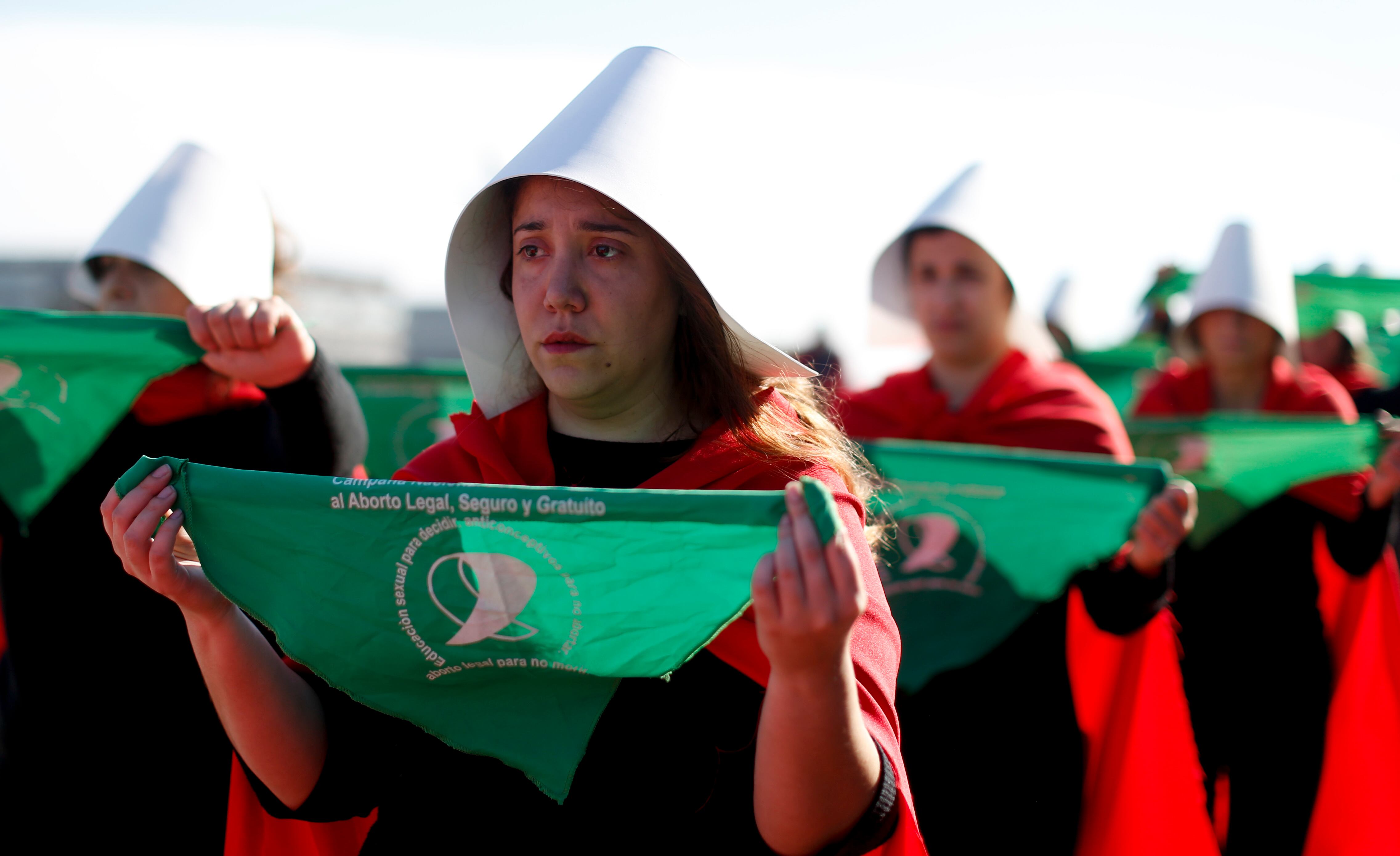 En una tarde soleada en el Parque de la Memoria, en la zona norte de Buenos Aires, 32 mujeres vestidas como las criadas de The Handmaid's Tale, con cofia blanca y vestido rojo, caminaron frente a los muros donde están inscriptos miles de nombres de víctimas de la última dictadura (1976-1983).