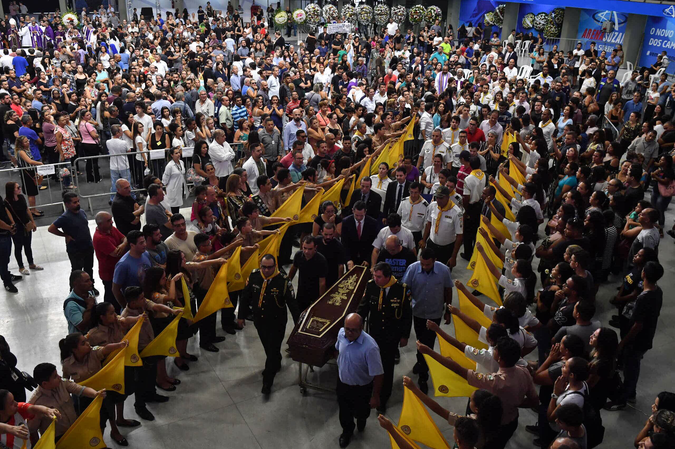 Miles de vecinos pasaron emocionados por la Arena Suzano de esta localidad situada a unos 50 kilómetros de la mayor ciudad de Sudamérica, convertida en el centro del horror desde que dos exalumnos de 17 y 25 años irrumpieron el miércoles en la escuela Raul Brasil acabando con la vida de cinco estudiantes y dos funcionarias, además de herir a otras once personas, antes de suicidarse.