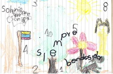 En un segundo dibujo, Soleiny dibujó una fruta conocida como juan soco; y a otra de una planta amazónica conocida como milpesos, con las que seguramente sobrevivieron. En el dibujo también se ve la bandera de Colombia y escribió “siempre bendecida”.