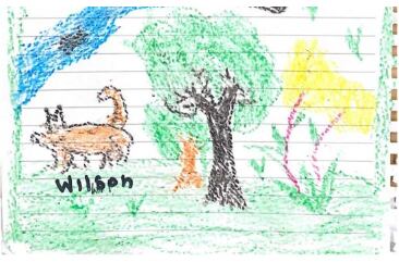 En el primer dibujo, Lesly dibujó con diversos colores al perro, con un color café claro que coincide perfectamente con las características de Wilson, también dibujó varios árboles y el cielo azul.