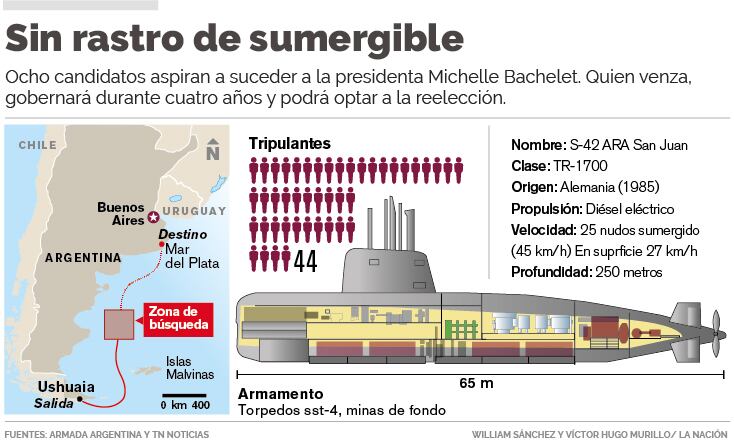 El sumergible diésel eléctrico clase TR-1700 de fabricación alemana y en operaciones desde los años 80 desapareció el 15 de noviembre cuando navegaba desde Ushuaia, en el extremo sur de Argentina, hacia su base en Mar del Plata, 400 kilómetros al sur de Buenos Aires, tras participar de un ejercicio de adiestramiento.