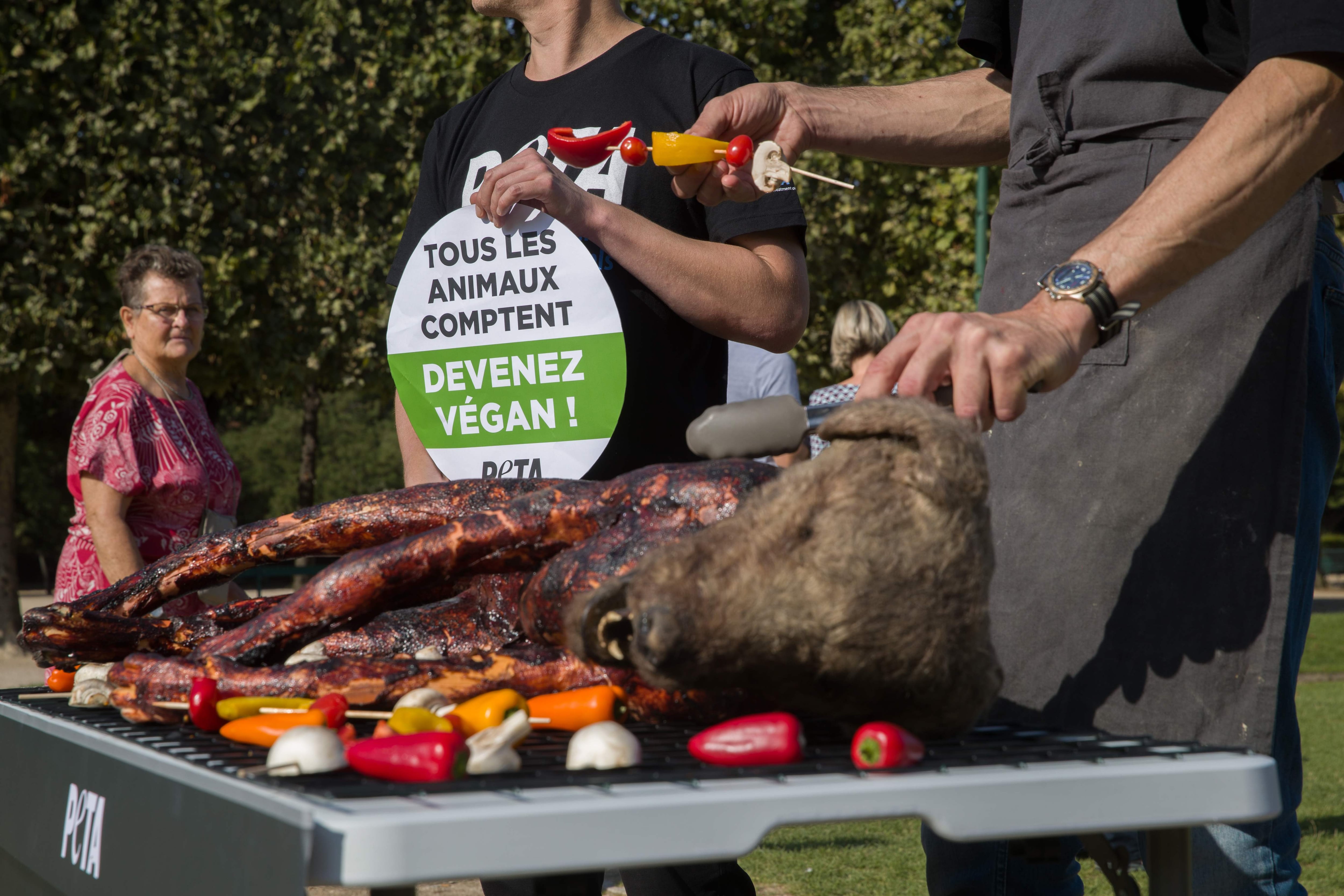 "Perro o cerdo: ¿cuál es la diferencia? ¡Hágase vegano!", rezaba una pancarta sobre el falso animal asado sobre una barbacoa.