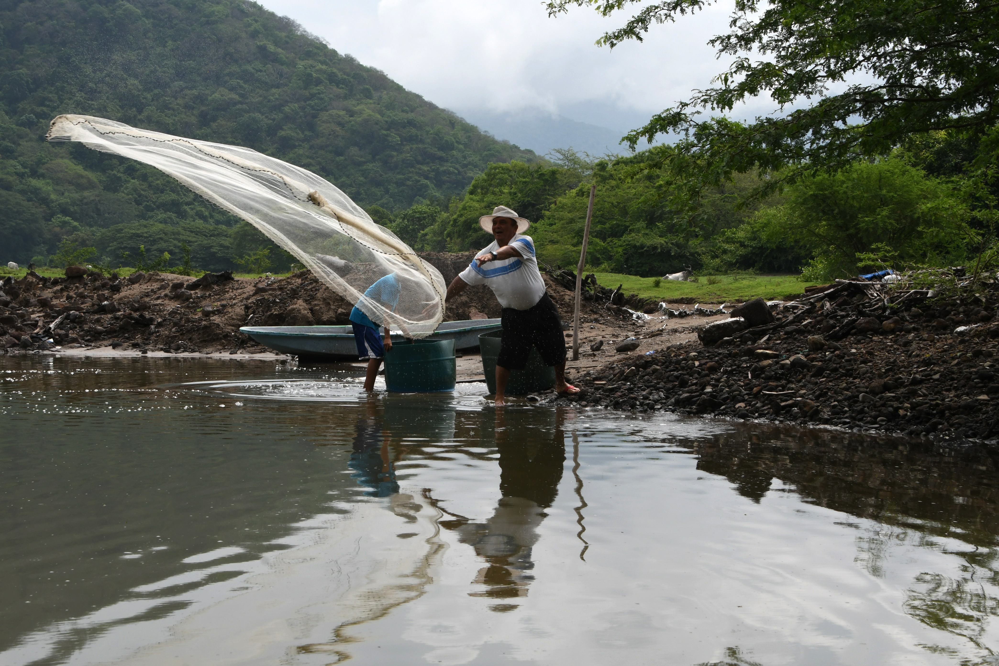 “Tengo mucho dinero invertido, soy una persona luchadora”, comenta mientras lanza la atarraya para pescar en una de sus dos pozas de cultivos de camarones en el terreno arenoso al pie de la montaña virgen de la isla.