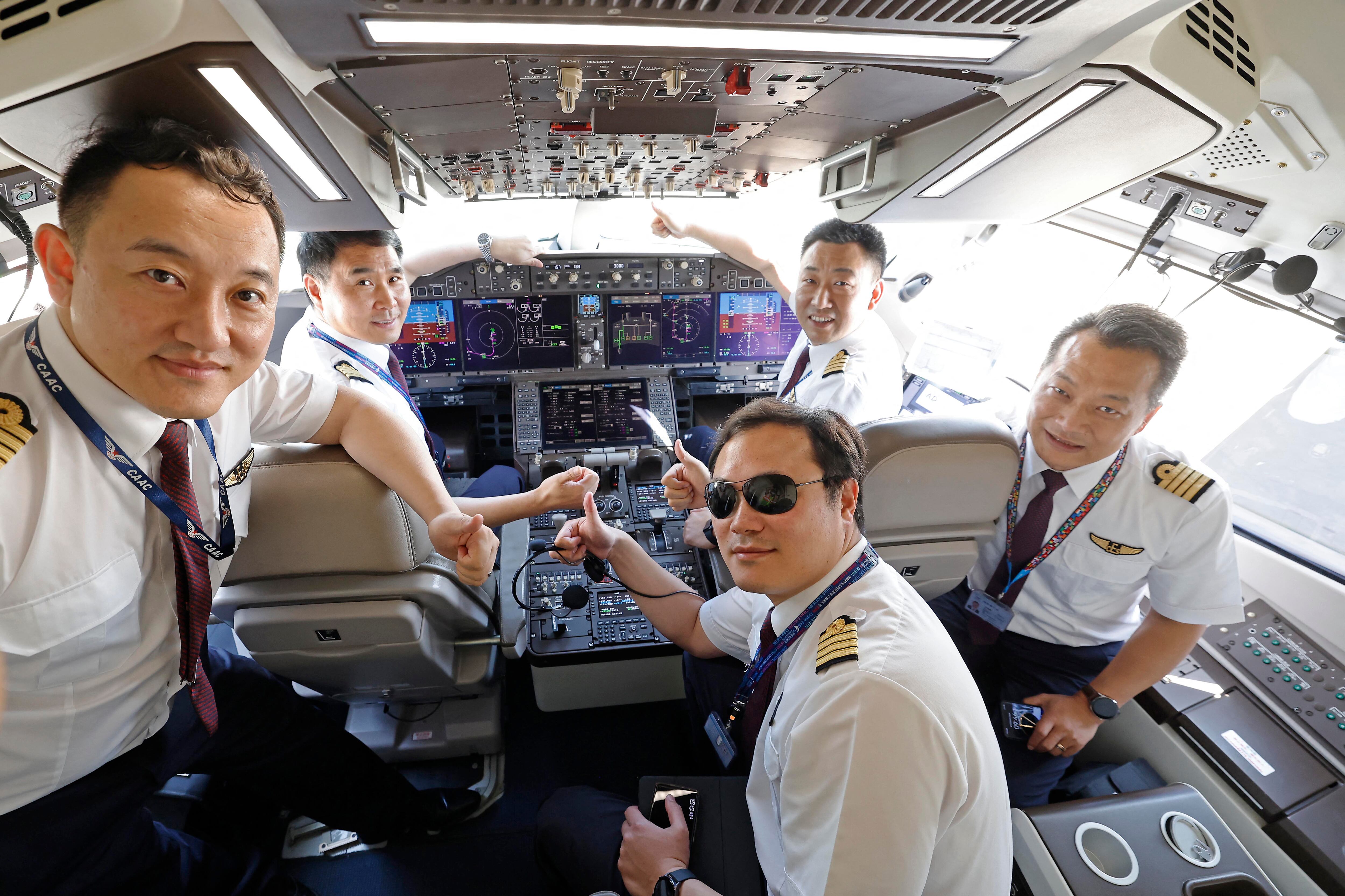 Antes del despegue, los medios de comunicación estatal mostraron a decenas de pasajeros reunidos bajo el sol en la terminal de Shanghái para admirar el imponente avión.