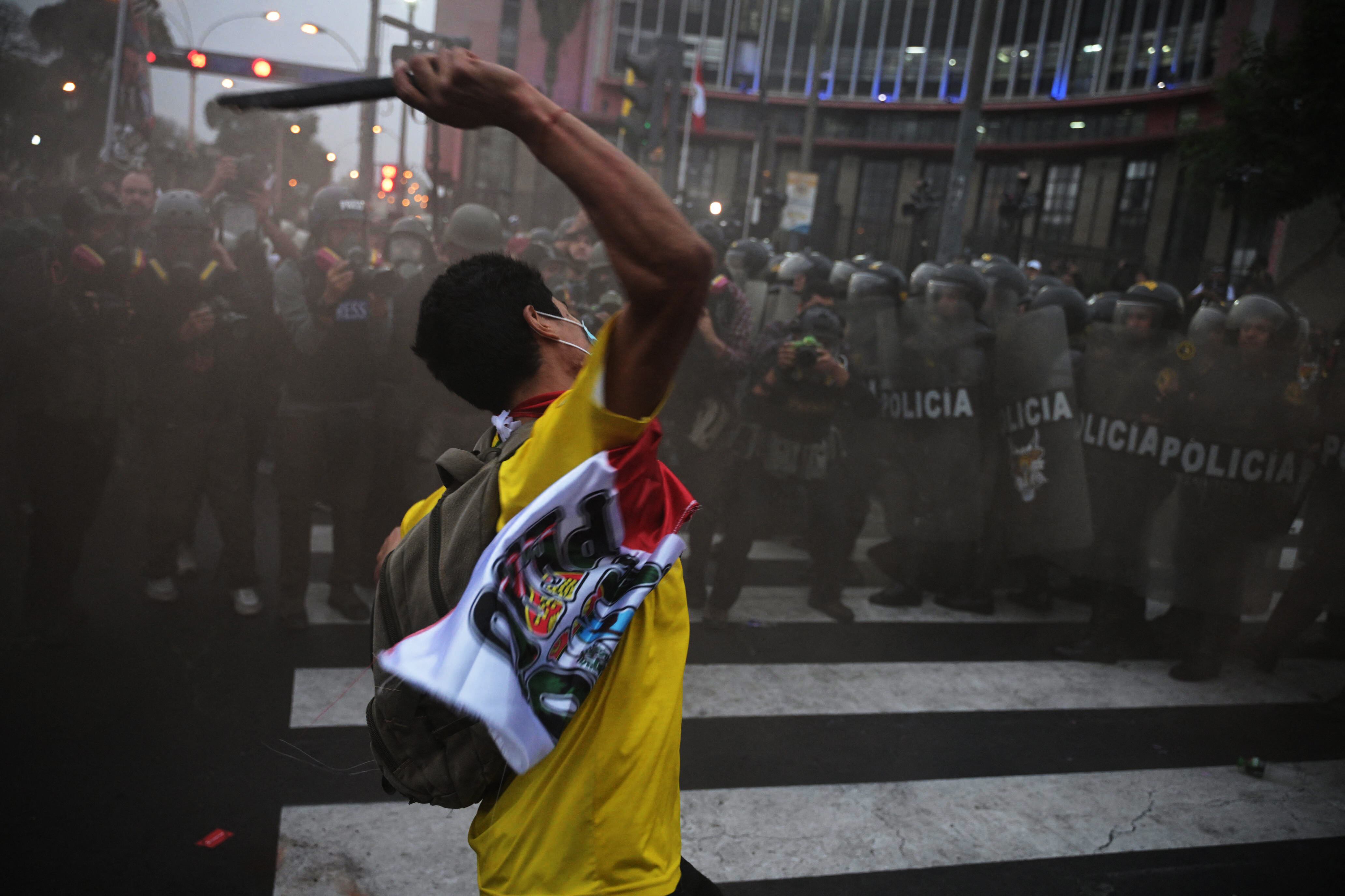 Según la Defensoría del Pueblo, la movilización en Lima fue escenario de enfrentamientos entre agrupaciones y fuerzas del orden en la noche, resultando seis civiles y dos policías heridos.