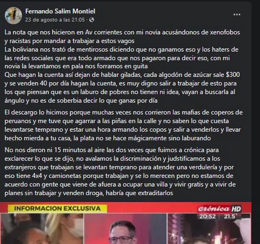 Sabag realizó un descargo en Facebook esa fecha, el 23 de agosto. En ese post, cruzó las críticas que dijo recibir a partir de sus comentarios en los medios. “Que hagan la cuenta así dejan de hablar giladas, cada algodón de azúcar sale $300 y se venden 40 por día hagan la cuenta, es muy digno salir a trabajar de esto”, indicó.
