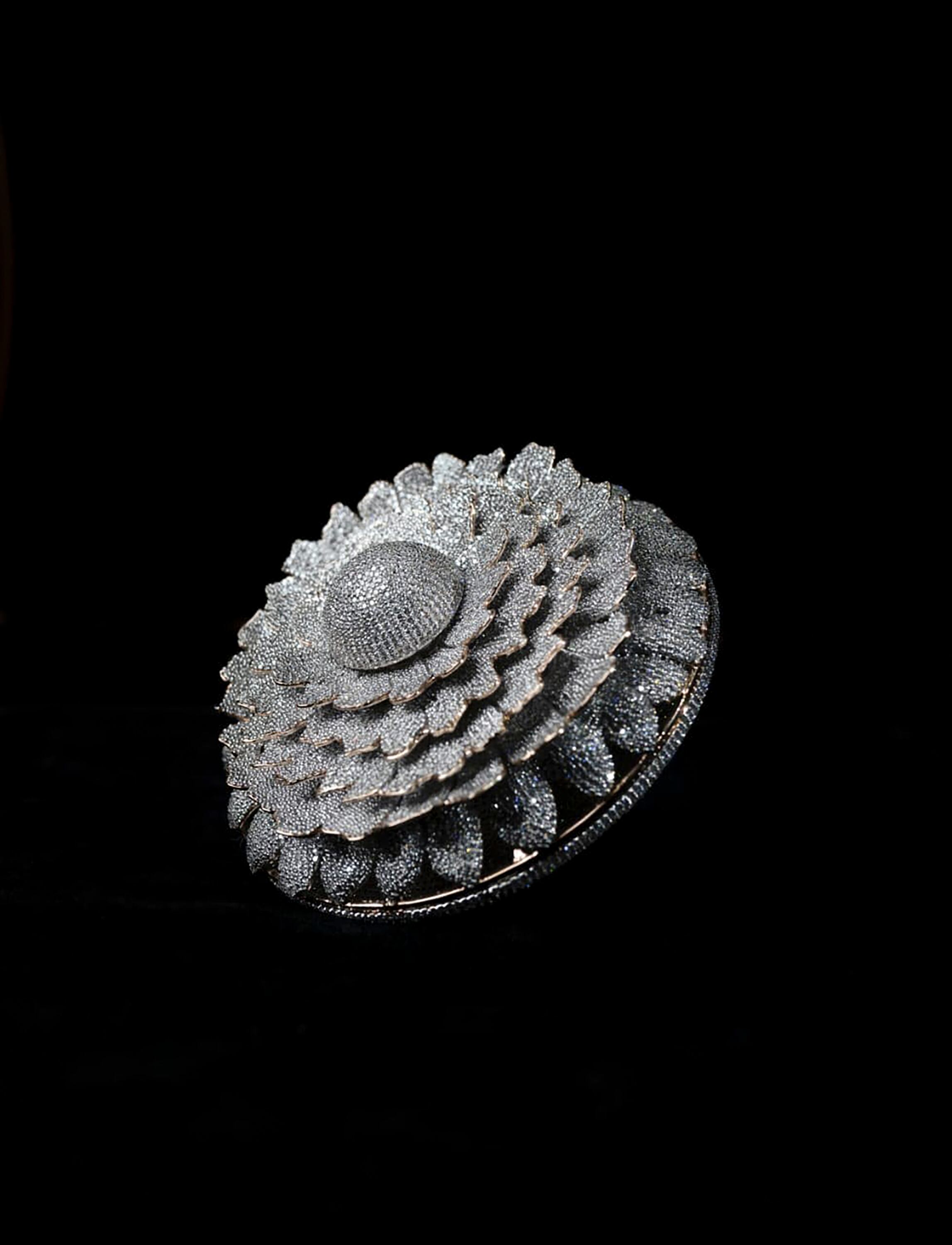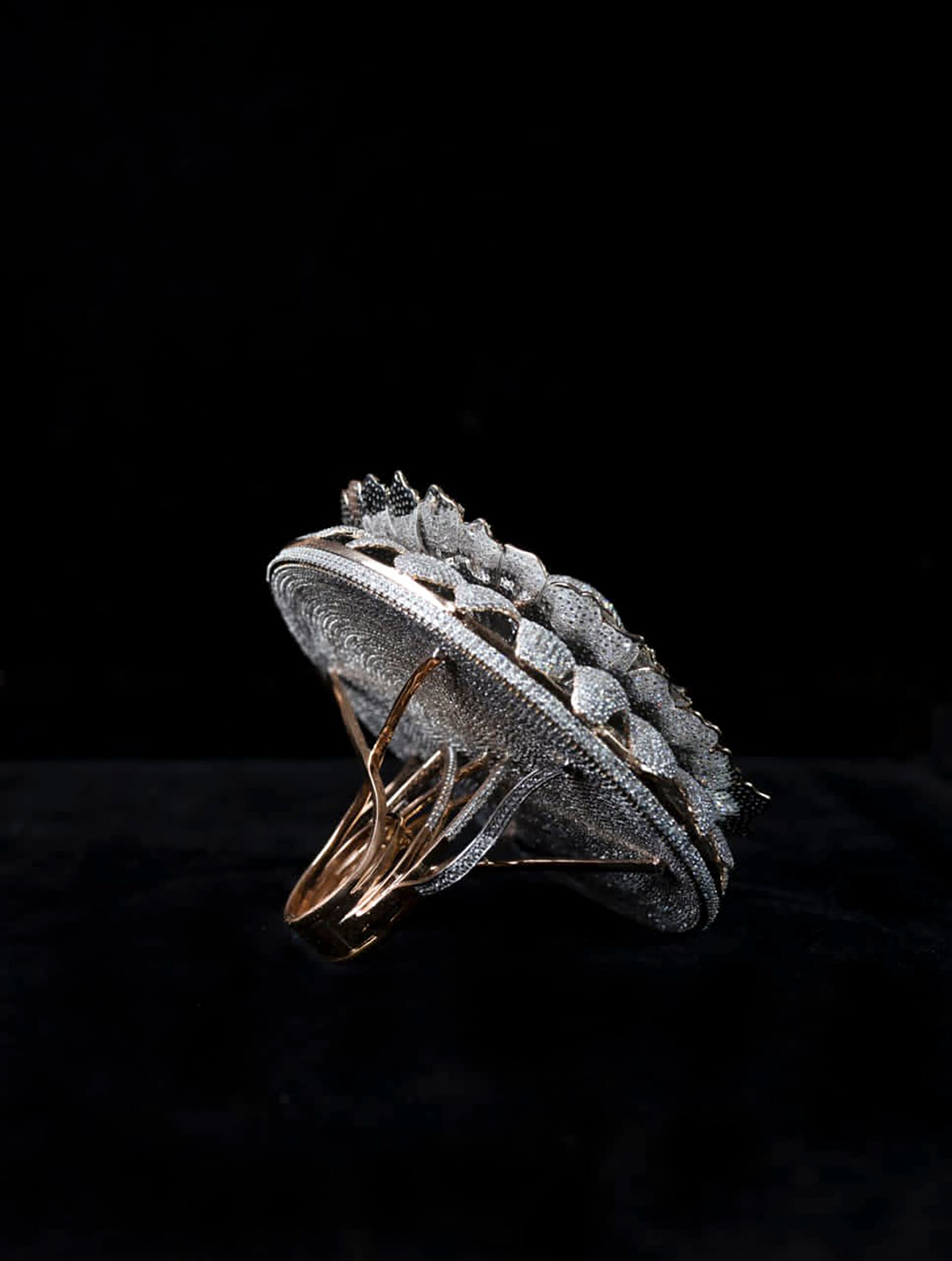 El anillo, que acaba de entrar en libro Guinness de récords mundiales, fue bautizado "La Maravilla- El Anillo de la Prosperidad", y muestra un intrincado juego floral, con un peso total de poco más de 165 gramos.